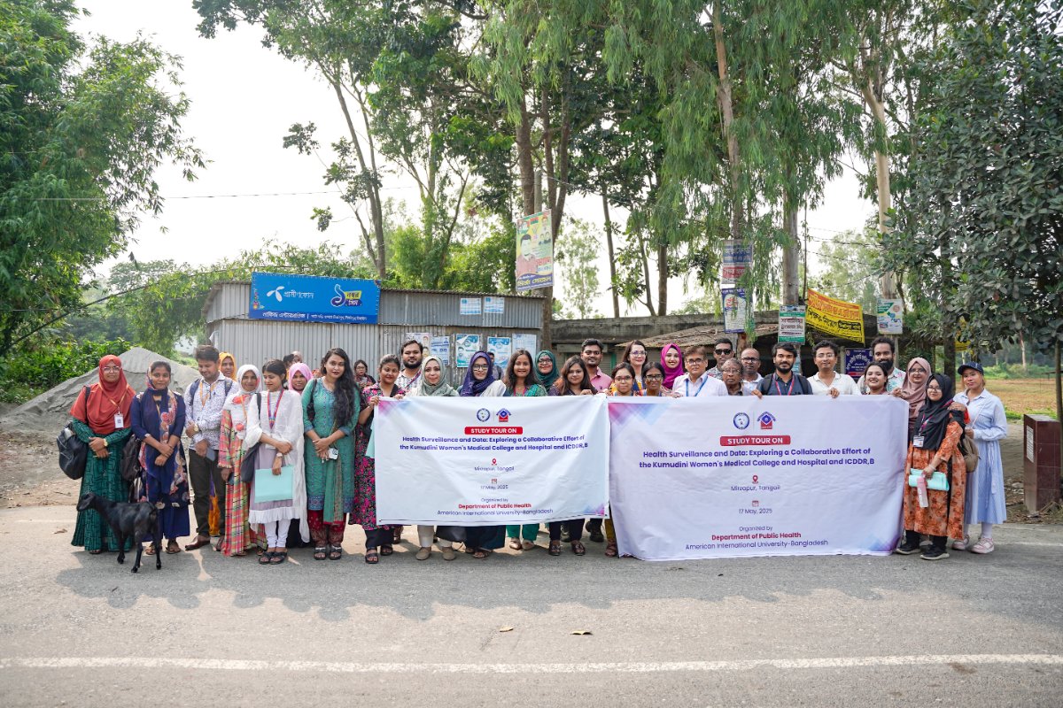 On Saturday, 17 May, 2025, a study tour at Mirzapur, Tangail was organized by the Department of Public Health, American International University-Bangladesh. Around 30 students and faculty members visited the health surveillance sites hosted by icddr,b and Kumudini Medical College. Prof. Md Abdul Halim, Principal, Kumudini Medical College delivered the welcome speech. Dr. A.S.G. Faruque, senior scientist at icddr,b and Dr. Sampa Dash from the surveillance briefed their innovative study on the assessment of vaccination coverage of the national EPI program. Dr Sabuktagin Rahman, Associate Professor, Department of Public Health, AIUB spoke about the purpose of the visit. He highlighted the importance of studying the MPH program at AIUB. Dr Julia Ahmed, faculty member, AIUB, in her remark, stated the importance of the event. She and Dr. Iffat Tasnim Haque, Assistant Professor, AIUB briefed the students to assemble into three groups. Teamed up with the icddr,b colleagues, they visited the three field sites to observe the data collection. The day-long program provided an exposure to the much-needed field experience, an integral component of public health education.