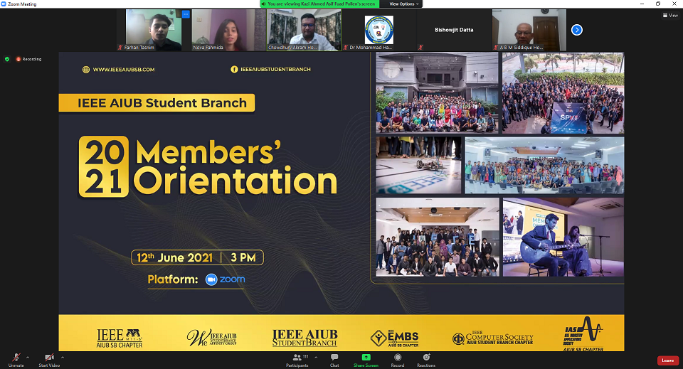 On 12th June 2021, the IEEE AIUB Student Branch organized the IEEE Members’ Orientation 2021 through the virtual platform of Zoom Meeting at 3 PM (GMT+6 hrs). The objective of this orientation program was to introduce and welcome the new members of the current year to the foundation and organogram of the IEEE AIUB Student Branch along with the acknowledgment of the invaluable hard work and commitment put in by the faculty members and students who fulfill the governing body's role in the previous year. The grand event was inaugurated by Prof. Dr. ABM Siddique Hossain, Advisor, IEEE AIUB Student Branch; Dean, Faculty of Engineering, AIUB with the recounting of IEEE's long history and enlightening the members on the organization's principal objective and vision.