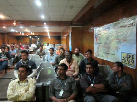 IEEE AIUB Student Branch organized an orientation program for the new members on Wednesday, 14th November 2012. The program was held at the AIUB Auditorium.The event started with a speech by Prof. Dr. ABM Siddique Hossain, Dean (Faculty of Engineering) giving a brief overview of IEEE, the institute and the formation of IEEE Bangladesh Section, followed by a speech from Mr. Md. Abdur Rahman,Assistant Professor and Head (Undergrad Program) of EEE Department emphasizing on the importance of IEEE publications and benefits of recognition from the institute and a speech by Mr. Rinku Basak, Assistant Professor and Head (Graduate Program) of EEE Department stressing on the benefits of IEEE membership and the resources available to students. Faculty members from EEE department Mr. Rony Kumar Saha, Assistant Professor and Senior Lecturers Mr. Bishwajit Banik Pathik and Mr. Md. Saniat Rahman Zishan also attended the event.Proceedings went on as is customary at such events with crests and certificates being given out to former Executive Body Members and the Counselor of the Branch in recognition of their work and contribution to the Branch, followed by a video presentation showcasing the events of the past year and a motivating speech from Branch Counselor Mr. Chowdhury Akram Hossain, Senior Lecturer, EEE Department, highlighting what the Branch has accomplished so far and its impact on the students. Later, certificates were given out to the volunteers acknowledging their tireless efforts throughout the year. The event concluded with the announcement and introduction of the new Executive Body Members.An Overview of IEEE AIUB Student Branch- IEEE AIUB Student Branch is one of the premier student societies at AIUB. The core purpose of IEEE is to foster technological innovation and excellence for the benefit of humanity. IEEE with its global technical community provides vast resources to aid students in their field of study and IEEE AIUB Student Branch has been helping students take advantage of these resources. The track record of the branch includes activities ranging from numerous workshops in the field of technology, to initiating and playing an important role in upholding the ideals of this university through community services.