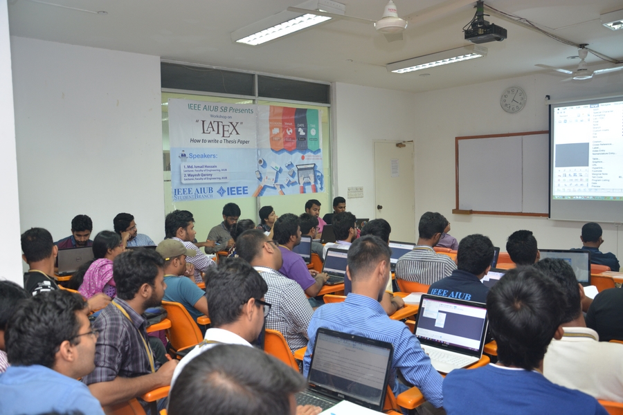 On 28th June 2015, IEEE AIUB Student Branch organized a workshop titled “Workshop on LaTeX & LyX” in Room No. 266, Building 2, Faculty of Engineering, American International University-Bangladesh (AIUB). The workshop was aimed at introducing the 100+ participants to the high quality typesetting system known as LaTeX and its complementary open-source document processor named LyX, along with their applications and the prospects they hold for engineering students. The event was led by two experienced instructors who shared their technical knowledge and guided the participants, in a hands-on interactive workshop.