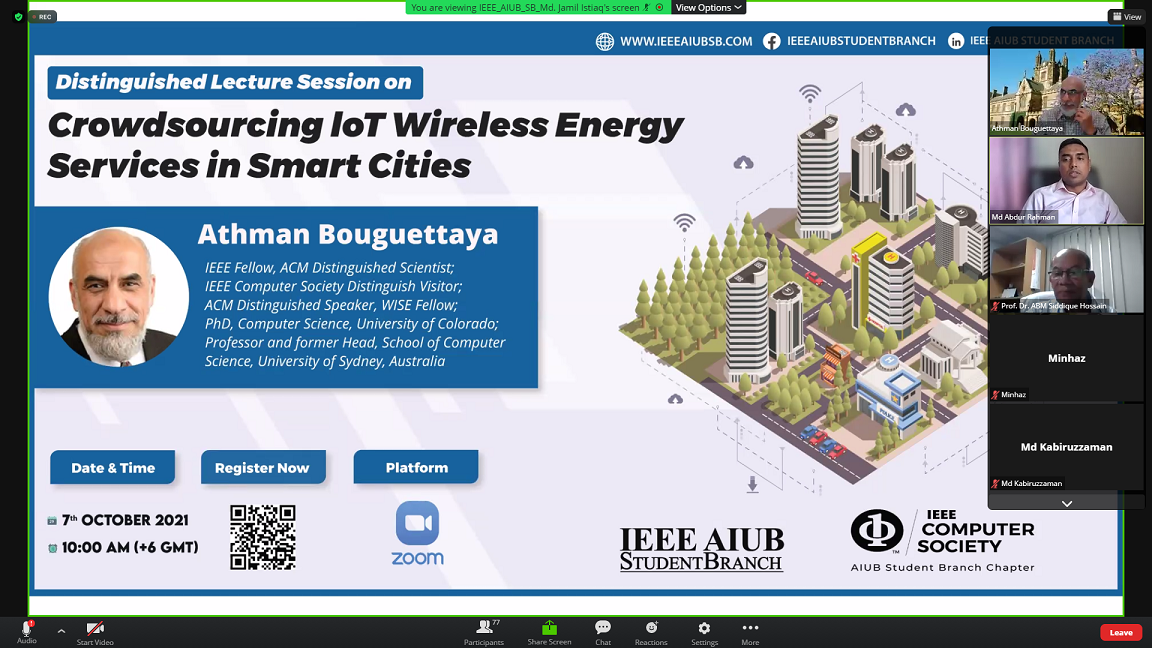On 7th October 2021, the IEEE AIUB Student Branch in collaboration with the IEEE Computer Society AIUB Student Branch Chapter successfully organized the Distinguished Lecture Session titled "Crowdsourcing IoT Wireless Energy Services in Smart Cities'' through the virtual platform of the ZOOM Meeting. The prime objective of this session was to enlighten the participants about the primary and brief concepts of Crowdsourcing IoT Wireless Energy, aspects of IoT, and the importance of wireless energy.