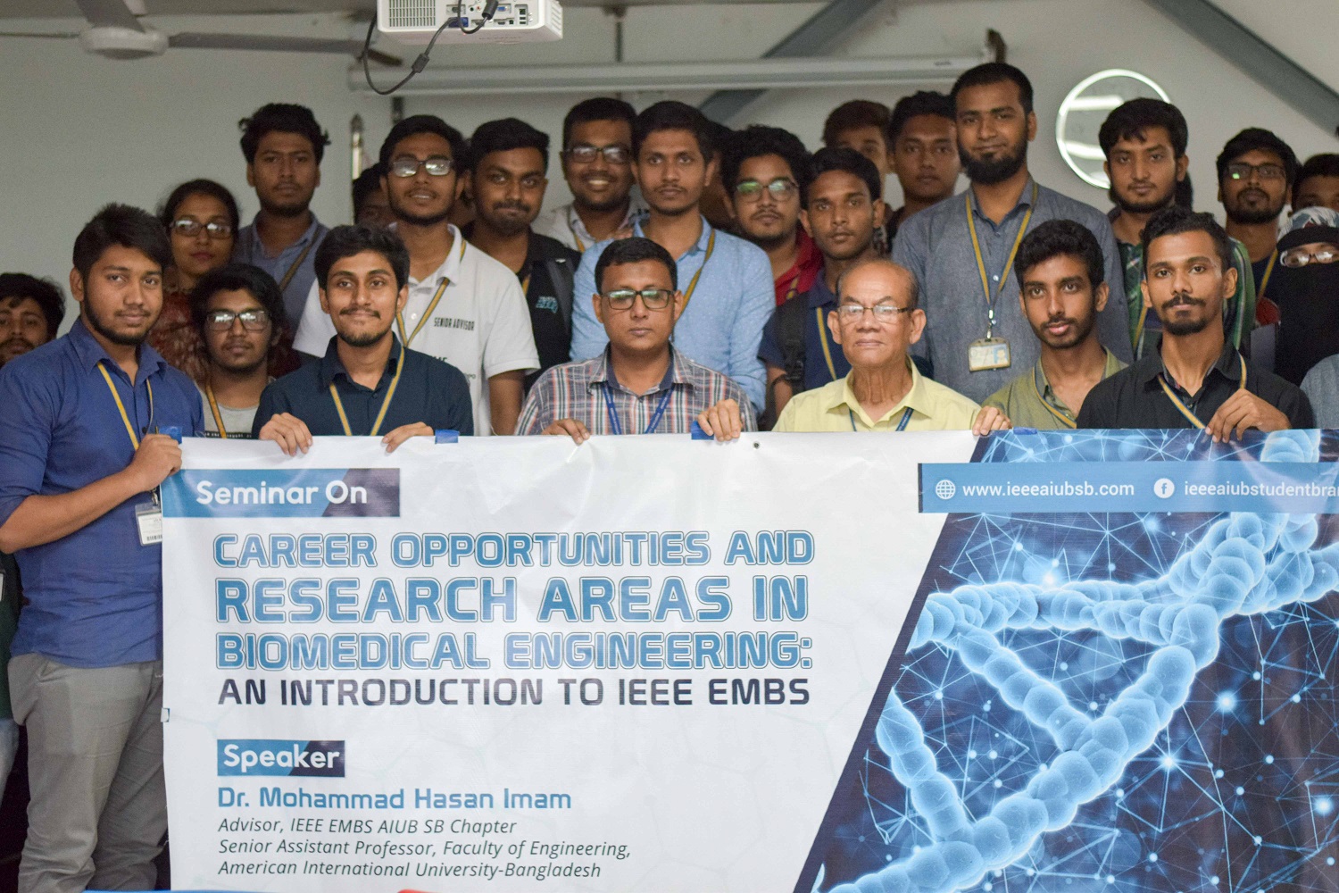 On 31st July, 2018 IEEE AIUB Student Branch in collaboration with IEEE Engineering in Medicine & Biology Society (EMBS) AIUB Student Branch Chapter successfully organized a seminar on “Career Opportunities and Research Areas in Biomedical Engineering: An Introduction to IEEE EMBS” at American International University – Bangladesh. The seminar focused on the applications of engineering skills for the advancement of the biomedical sector and also introduced IEEE EMBS which is the world’s largest society for biomedical engineers providing various opportunities for its members. The seminar was conducted by Dr. Mohammad Hasan Imam, Senior Assistant Professor, Faculty of Engineering, AIUB; Advisor, IEEE EMBS AIUB SB Chapter, who is an expert on Bio-signal processing and modeling, biomedical electronics and its applications.