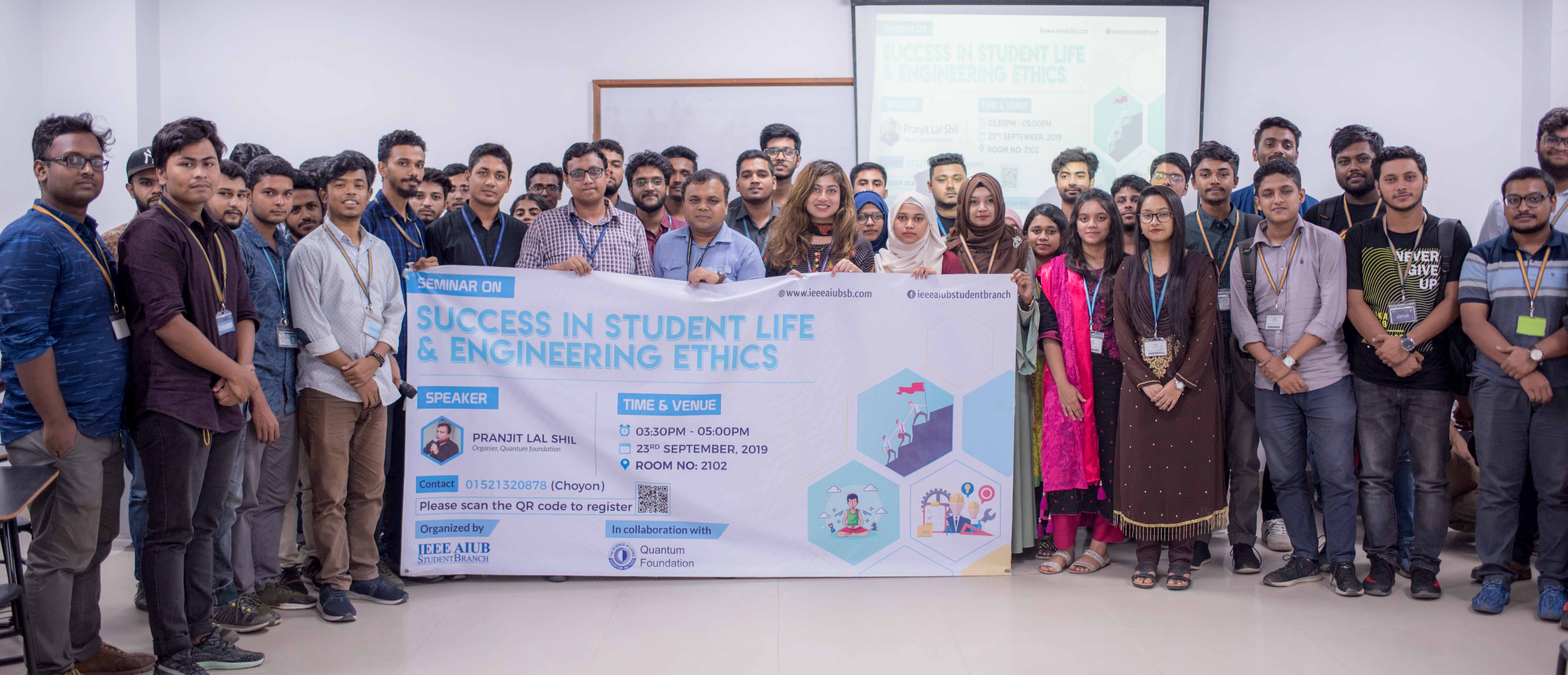 On 23rd September 2019, IEEE AIUB Student Branch successfully organized a seminar on “Success in Student Life and Engineering ethics” in collaboration with Quantum Foundation at American International University – Bangladesh. The goal of the seminar was to inspire the young leaders of the generation towards meditation and present to them the harmful delicacies of today’s society, which many of us enjoy and are getting addicted to unconsciously. The event was hosted by Mashrur Sakib Choyon, Event Designer, IEEE AIUB Student Branch; Quanteer, Quantum Foundation. In the beginning, he presented the usefulness of meditation and briefly explained the activities of Quantum Foundation and their work. After that, he demonstrated the consequences of being addicted to smartphones with a video clip and explained the harmful effects of using famous social apps too much.