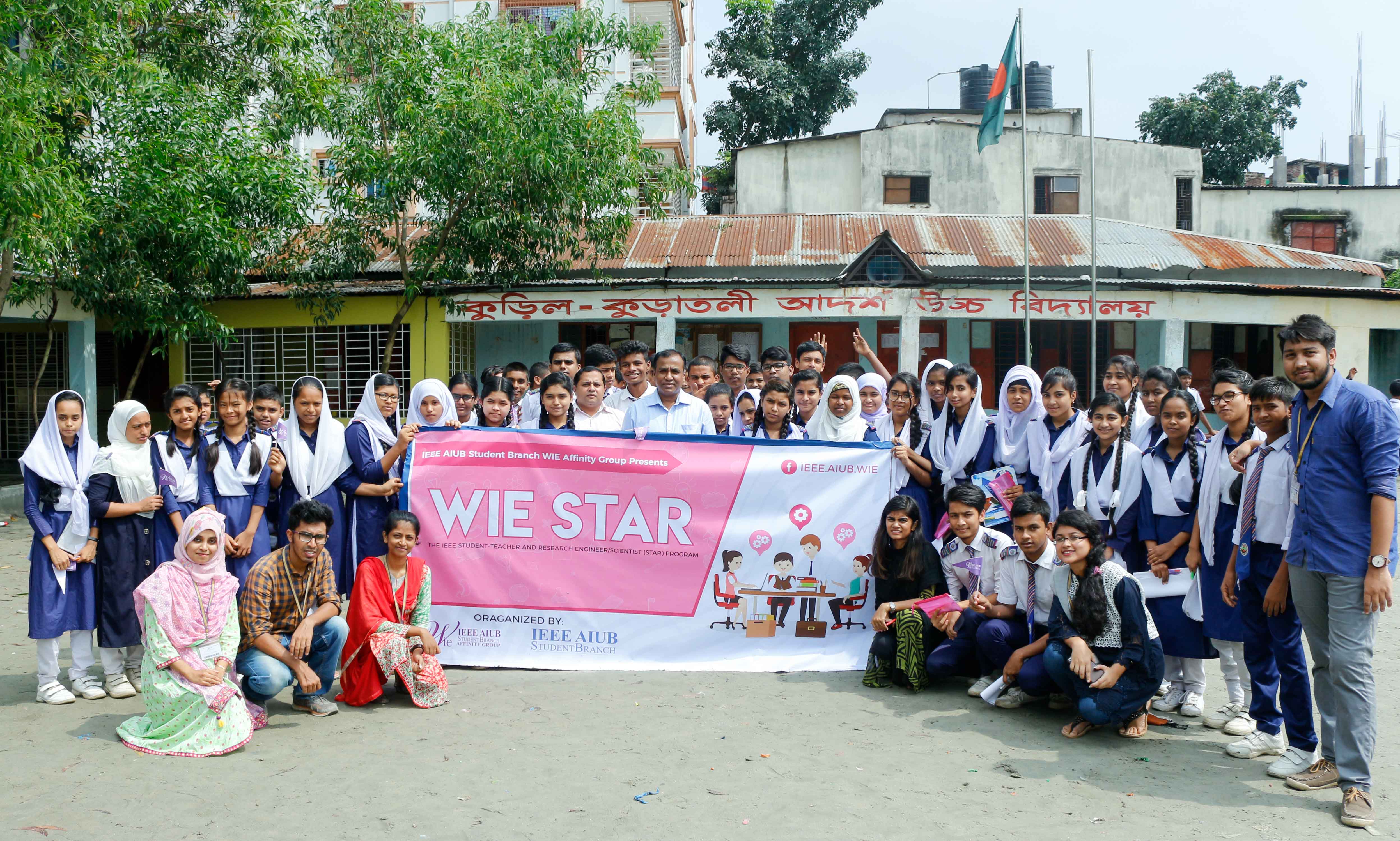 On 29th July 2018, IEEE AIUB Student Branch WIE Affinity Group in association with IEEE AIUB Student Branch successfully organized an outreach program titled “WIE STAR” at Kuril- Kuratali Ideal High School. The event solely focused on improving the perception of the field of engineering, motivating more girls to pursue an engineering career, as well as promoting the endless possibilities that can result from considering engineering as a possible career option. Students from class 6 to 10 participated in this outreach program.