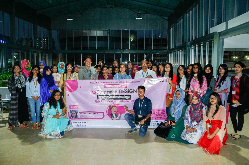 On 15th October 2018, IEEE AIUB Student Branch WIE Affinity Group in association with IEEE AIUB Student Branch successfully organized a workshop on “Graphics Design for Women in Engineering” at American International University - Bangladesh. The workshop encouraged women to learn and gather skill in graphic designing. The workshop mainly focused on some of the basic designs and uses of different types of tools in Adobe Photoshop CC. The workshop was carried out by Ms. Rani Ellen V. Ramos, Animation lecturer, Animation Program – MMC Department, AIUB.