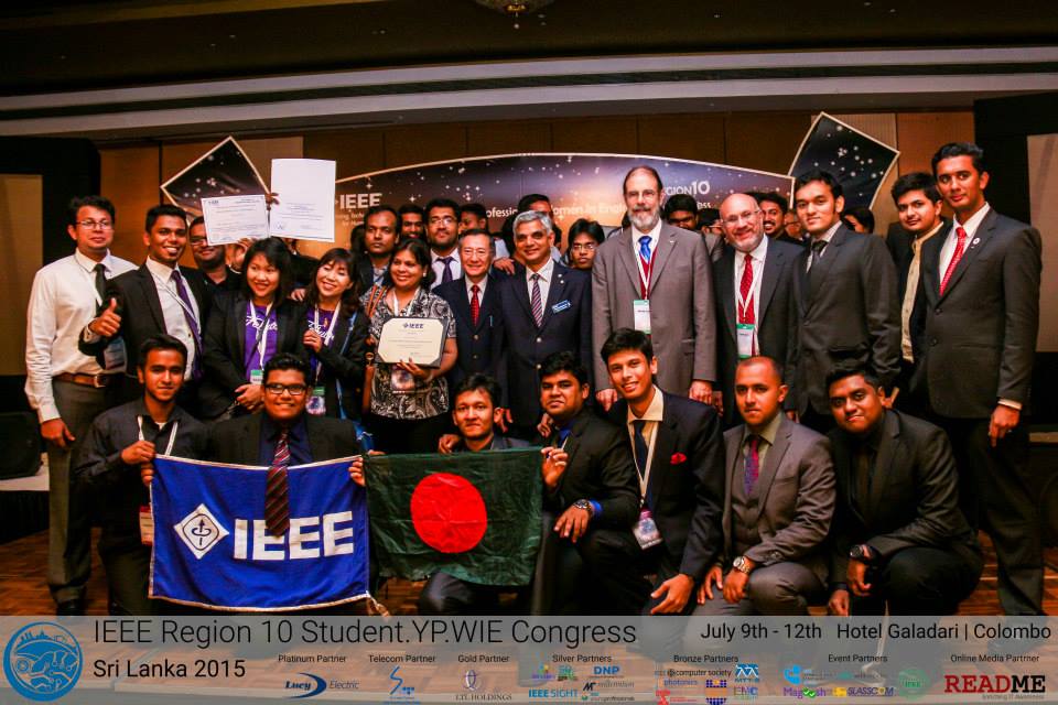 The IEEE Region 10 Student/YP/WIE Congress is biennial event, which provides an opportunity for young IEEE student members & professionals from all around Asia-Pacific (IEEE, Region-10) to build a strong bonding and network amongst the dedicated volunteers, learn and implement new initiatives from IEEE experienced volunteers and enhance their technical knowledge. The 2015 congress focuses on empowering Student, YP (Young Professionals), and the WIE (Women in Engineering) entities of IEEE. The Congress was based upon the theme of “Today’s youth for a better tomorrow” and catered to several other needs of the congress audience including Emerging Technologies, deep dive about IEEE, its structure and operations, and an amazing networking opportunity with peer volunteers from a delegation that will consist of people representing over 30 distinct nationalities and the principal entities of IEEE including WIE, Student and YP. The R10 congress was held on July 09th to July 12th, 2015 in Hotel Galadari, Colombo, Sri Lanka. IEEE Bangladesh Section was represented by different Student branches, namely AIUB, UIU, BUET, IUT, AUST, IUB and EWU Student branch, comprising of total 17 members. IEEE AIUB SB was represented by Mr. Chowdhury Akram Hossain, Assistant Professor, Department of EEE, AIUB & Mentor, IEEE AIUB SB along with Nasim Al Islam, Chairperson, IEEE AIUB SB; Mahmudul Haque Jishan, Vice-Chairperson, IEEE AIUB SB and Mohammad Taufiquzzaman, Former Chairperson, IEEE AIUB SB. The 4 day event was packed with inauguration ceremony, seminars, activities, competitions, gala night, award giving ceremony, multi-cultural night, meetings & dedicated events individually for each track like Student, YP, and WIE.