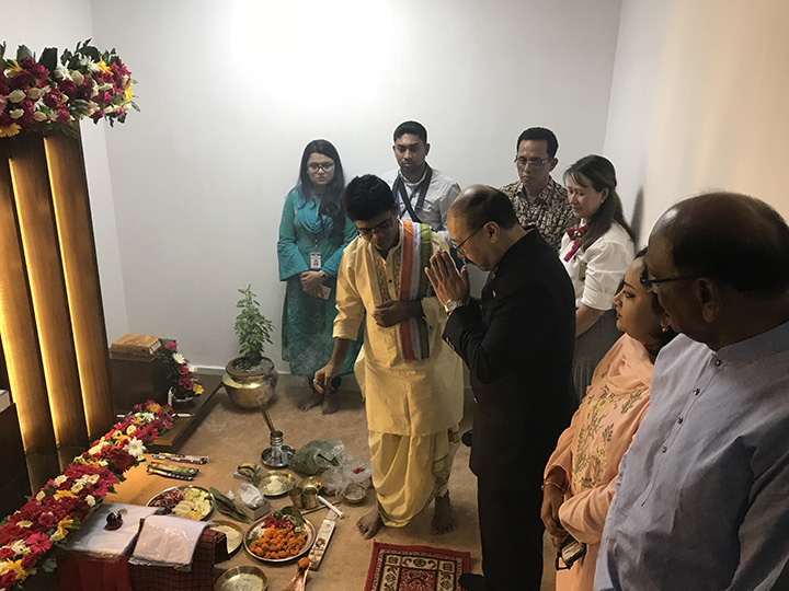 Secularism has long been a strong belief at the American International University – Bangladesh (AIUB). Opening its hearts and gates to students and staff from different ethnic backgrounds, races, and of course, religion, AIUB has always welcomed everyone into their family. And it is with that very notion, that the campus not only houses a Mosque for its Muslim community, but even accommodated a Prayer Room for the Buddhist, a Church for the Christians, and inaugurated a Temple for its Hindu Community today. The honorable High Commissioner of India, H.E Mr. Harsh Vardhan Shringla, graced the occasion with his presence, along with his respected delegation from the embassy. He was received by the Vice Chancellor, Dr. Carmen Z. Lamagna, the Founder Member, Treasurer, and Vice President of Human Resources & Administration, Dr. Hasanul A. Hasan, and the Founder Member and Vice President of Student Affairs, Mrs. Nadia Anwar, together with the various Deans and Directors of the university. After the inaugural ceremony, a religious prayer was offered according to Hindu customs, in which both students and staff of the community participated wholeheartedly. H.E Mr. Shringla was then taken on a campus tour, where he visited the modern science and engineering laboratories, the classrooms throughout the annex buildings, and finally the newly set-up library, where he generously donated a number of books to the university. The honorable High Commissioner expressed his gratitude towards the university, as did the management for his valuable time, and looked forward towards working together in future endeavors with the institution in the long run.