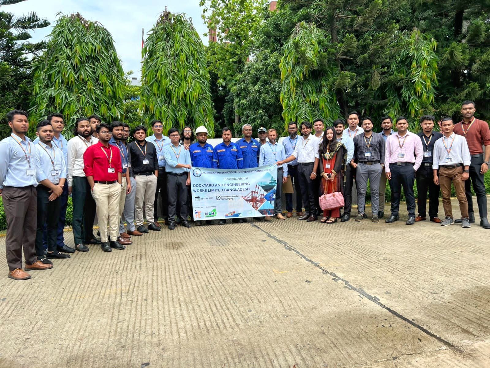 On Thursday, May 22, 2025, the Faculty of Engineering(FE) organized an Industrial Tour, supported by IEOM AIUB Student Chapter, to the ''Dockyard and Engineering Works Limited Bangladesh'' located in Sonakanda, Bandar, Narayanganj. Twenty-three students from the Department of Industrial and Production Engineering(IPE) were accompanied by Mr. Mahamudul Hassan, Assistant Professor,FE, AIUB and Dr. Md. Mahadi Hasan, Assistant Professor, FE, AIUB both of whom coordinated the tour which aimed to provide practical insights into shipbuilding and dockyard maintenance.