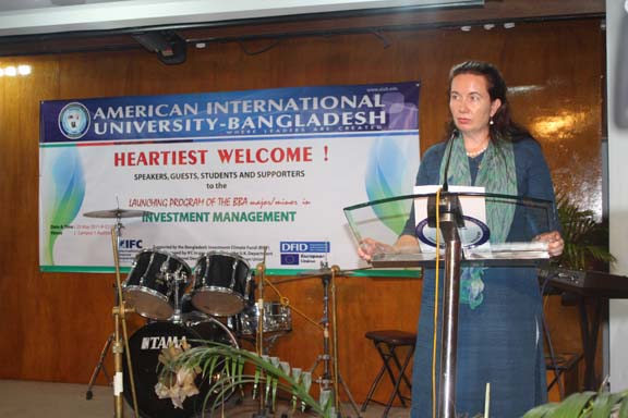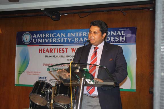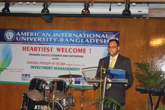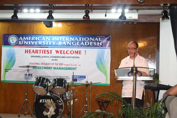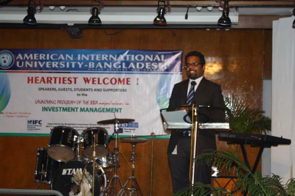 The Launching Program was held in Campus 1 Auditorium of the university on 25 May 2011 at 3:00 o’clock in the afternoon anchored on three (3) objectives: 1) to create awareness and understanding of the nature of the course, 2) to convey to the potential students the value and prospects of taking the course for their future career, 3) to provide overview of the investment climate of Bangladesh for better appreciation by the students, faculty and other stakeholders. There were three (3) speakers invited to discuss the importance and prospects of investment management for students taking the course. Mr. Tanjil Azam Chowdhury, Chief Executive Officer of EC Securities Ltd. who on behalf of the corporate expounded on the need for graduates seeking employment to have functional knowledge of the current and future state of investment climate of the country. The two other speakers are from the BICF, Ms. Laura Watson, Senior Private Sector Development Specialist and Mr. Shihab Ansari Azhar, Stakeholder Engagement Advisory Services in South Asia, who both underscored the importance of producing professionals who can influence future investors and the appropriate management of investments. They also acknowledged the significant role of AIUB in partnering with the BICF in making Climate Fund Project a success in the university. They assured the university that BICF will continue to provide assistance in providing resource materials and expertise while the course is on-going until the new batch of graduates can be produced.