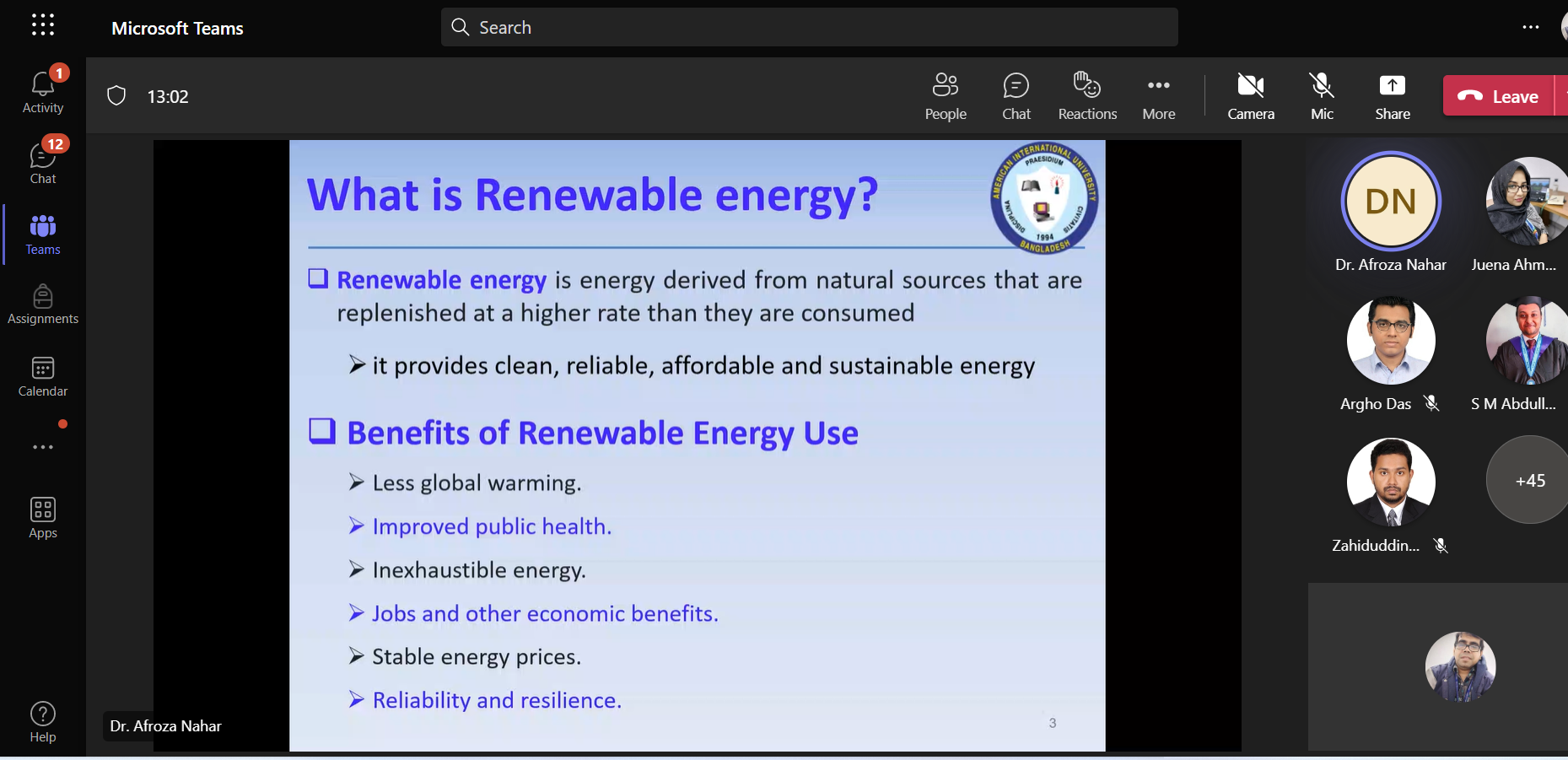 In this 14th session, the research talk was presented by Dr. Afroza Nahar (Associate Professor, Dept. of Computer Science). Dr. Afroza Nahar has very good knowledge and experience on research works, especially in the field of Computational Modeling and Thermal System. As an experienced researcher, she presented her research talk on “Computational Modeling for photovoltaic Thermal System (PV/T)”.