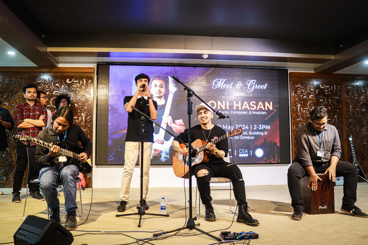 Music is what feeds your soul. The music industry of Bangladeshi bands has been a vibrant scene thriving with young and talented musicians, both from the golden eras as well as the modern times. One such legendary icon is Oni Hasan, the former lead guitarist of the alternative rock band, Vibe, and later of the heavy metal band, Warfaze. A renowned guitarist, composer, and musician, he has been an idolized inspiration for aspiring musicians across Bangladesh and beyond borders. Revisiting his home country after a decade, despite his busy schedule of numerous shows and performances, he graciously accepted the invitation to share a few valuable moments with his fans at the American International University – Bangladesh (AIUB). On the 12th of May 2024, an exclusive “Meet & Greet with Oni Hasan” for the members of AIUB’s student organizations was organized by the AIUB Performing Arts Club (APAC), facilitated by the Office of Student Affairs (OSA).