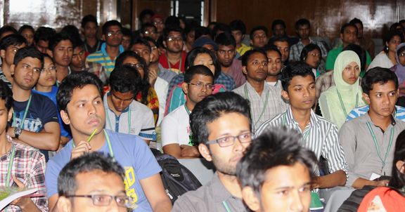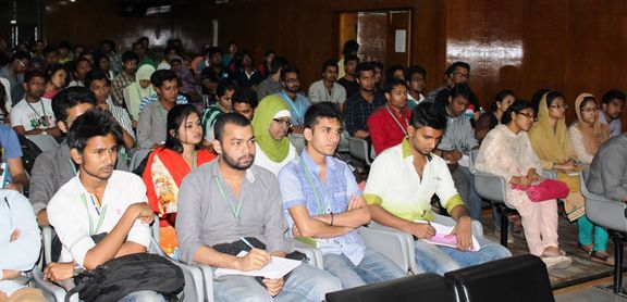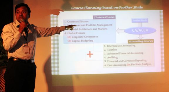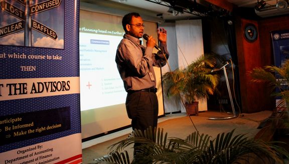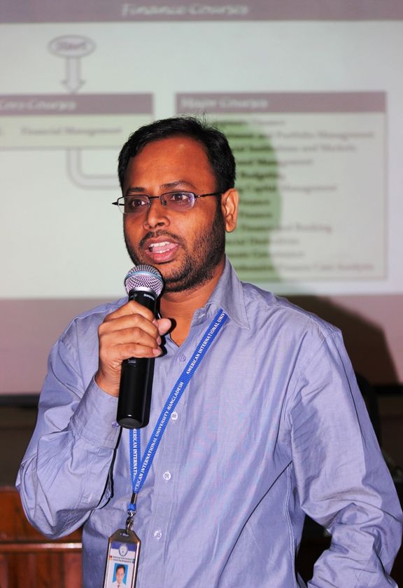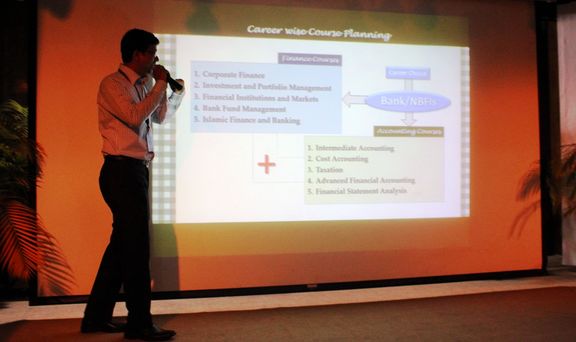 Keeping these student concerns in mind, both departments jointly organized the event, which received overwhelming response from the student community. In front of a packed audience, Mr.Zakaria Masud and Dr. Md. Dulal Miah spoke about the prospects of studying accounting and finance and future opportunities this might lead, both at home and abroad. Thereafter, Mr. Faridul Alam talked about courses which would be helpful for students pursuing professional degrees in Accounting including CMA, CA, ACCA, CIMA etc. On the other hand, Mr. Kamrul Bari explained the logical sequence and choice of courses which would be helpful for finance concentrated students who are considering their career in the areas of finance including Conventional and Islamic Banks, Non-Bank Financial Institutions, also who are interested to pursue higher study in Finance as well as professional degrees like CFA. Then there was an open Q & A session where students asked questions about their individual concerns regarding various issues in Finance and Accounting.