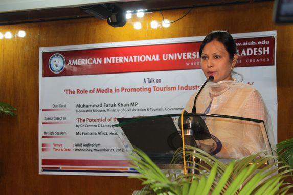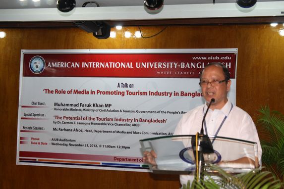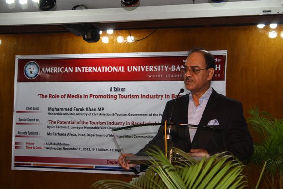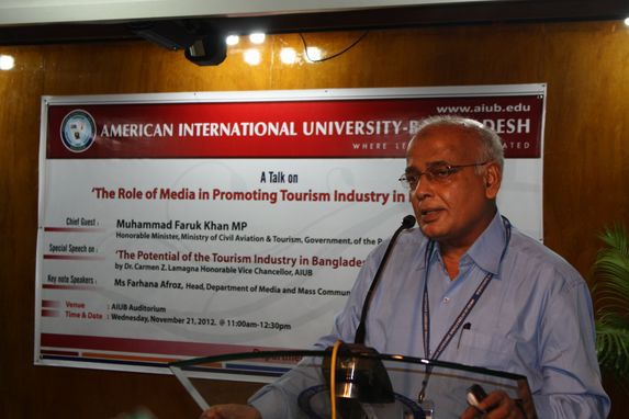 Mr Faruk Khan, Minister for Civil Aviation and Tourism, said that the government has identified tourism as one of the key sectors for the private entrepreneurs to invest and the government will provide full policy support for private initiatives to develop tourism in Bangladesh. One tourist supports seven jobs. Moreover, value addition in hospitality industry is 100 per cent compared to 30 to 40 per cent in garment industry, he added. Mr Khan said tourism also helps improve image of the country and added that BTB is working to promote the sector and brand Bangladesh to the world. In 2011, the board participated in 12 international tourism fairs around the world and its audio visual presentation ‘Beautiful Bangladesh’ won the third prize at one of those. Mr Khan also informed that two master plans are being prepared for the development of Cox's Bazar and Kuakata. He was speaking at a seminar on “The Role of Media in Promoting Tourism Industry in Bangladesh” organized by the department of Media and Mass Communication at AIUB on November 21, 2012 at Campus 1 Auditorium of the university. Vice-Chancellor Dr. Carmen Z. Lamagna inaugurated the program. She said that Tourism in Bangladesh has its potential but it has its challenges too. The future tourism strategy should have two primary aims. First: the development has to be sustainable including economical, cultural and environmental considerations. The second: aim for a Bangladeshi tourism strategy is that actions should be taken to increase the tourist income by raising the numbers of tourists. Tourism and travel is alive and well in Bangladesh and she encourages all the students to visit the wonderful sights the country has to offer.