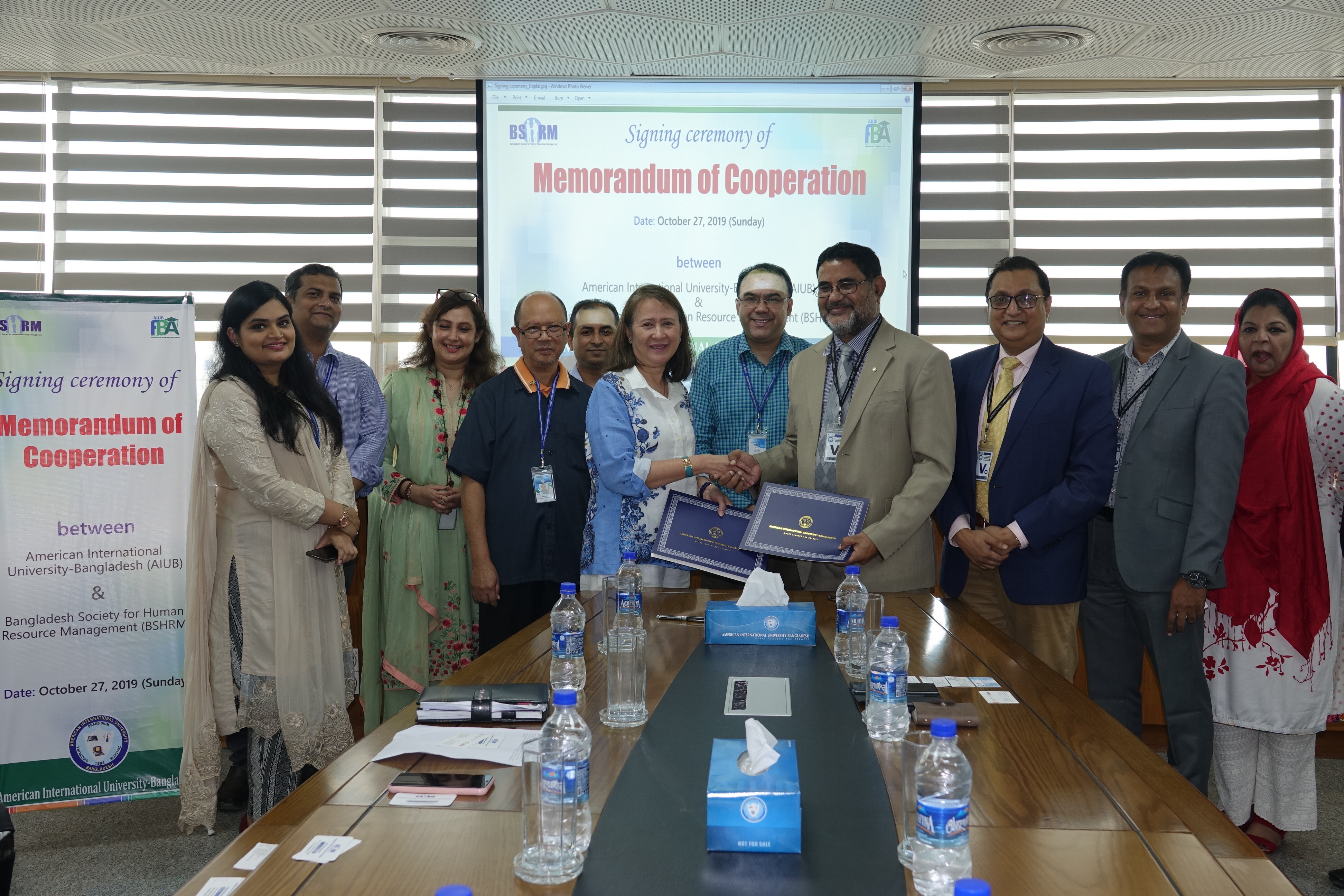 The contemporary business environment demands a strong link between the corporate sector and academia. The universities produce graduates to join the labor market at large, and the companies in return need universities to come up with programs which cater to their overall needs. To do this, AIUB has always maintained a strong link with industry leaders and managers to generate feedbacks as a challenge to enrich or revise the curriculum to be incorporated in the academic programs. To concretize this linkage or partnership, the American International University – Bangladesh (AIUB) signed a Memorandum of Cooperation (MoC) with Bangladesh Society for Human Resource Management (BSHRM), a society of HR Professionals engaged in providing academic training, development, consultancy, research, evaluation and other development activities in the field of human resource and management.