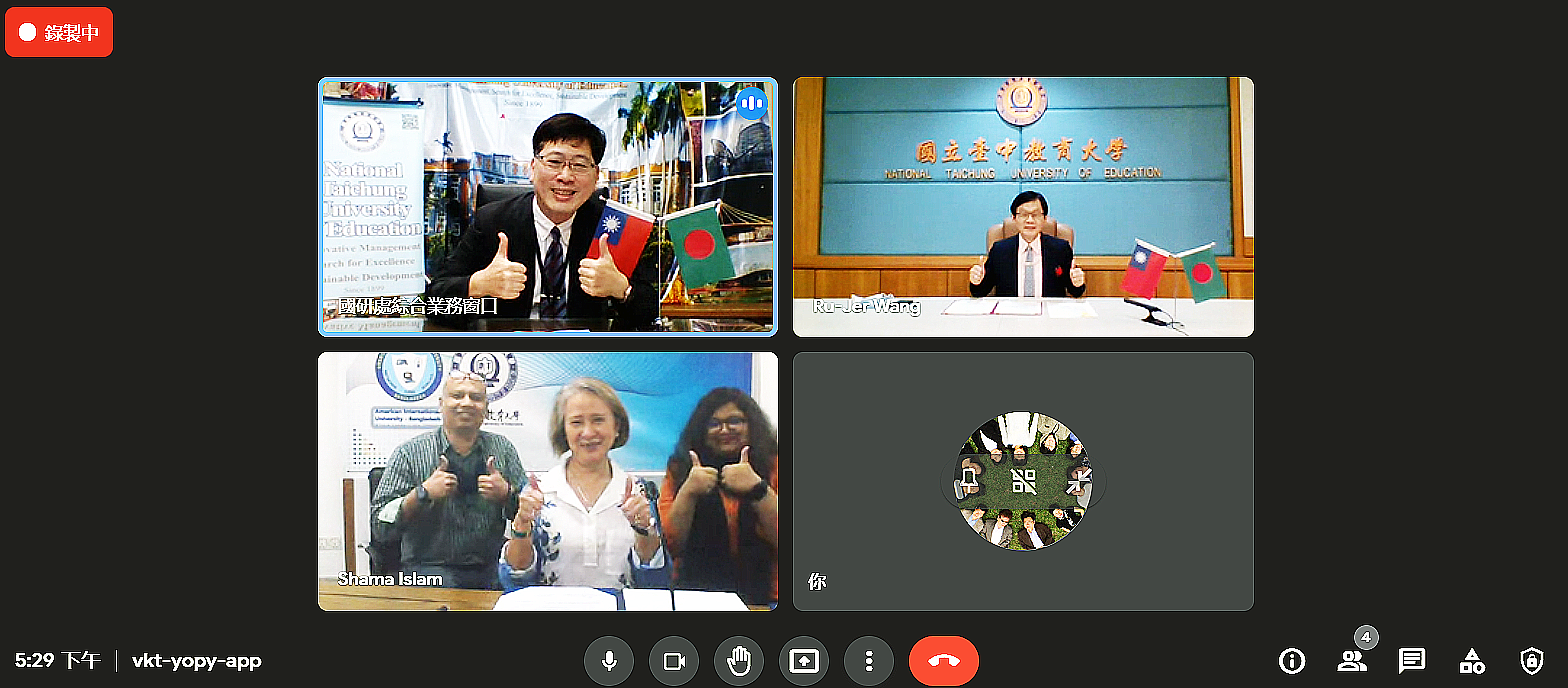 Expanding on its international collaborative network, the American International University – Bangladesh (AIUB) forged a strategic partnership with the National Taichung University of Education (NTCU), Taiwan, aiming towards mutually advancing the research capacities, elevating academic programs, and exchanging ideas. The Memorandum of Understanding (MoU) was signed on the 5th of October 2021, through a virtual signing ceremony between the institutions on the Google Meet platform. The agreement was endorsed by Dr. Ru-Jer Wang, the President of NTCU and Dr. Carmen Z. Lamagna, the Vice Chancellor of AIUB, both of whom shared their thoughts on the pathway for moving forward in executing the MoU. Dr. Eric Chu, a Professor in the Department of International Business and the Dean of the Office of International Affairs at NTCU shared his hopeful remarks on the actualization of the alliance, followed by Mr. Manzur H. Khan, an Associate Professor in the Faculty of Science & Technology (FST) and the Director for the Office of Student Affairs (OSA), who also expressed his keen interests for implementing various programs under the signed agreement. The collaborative partnership was facilitated by Ms. Hui-Yi Yung, from the Division of International & Cross-strait Affairs at NTCU and Ms. Shama Islam, an Assistant Professor in the Department of Marketing of the Faculty of Business Administration and the Special Assistant in the Office of the Vice Chancellor and Student Affairs at AIUB.