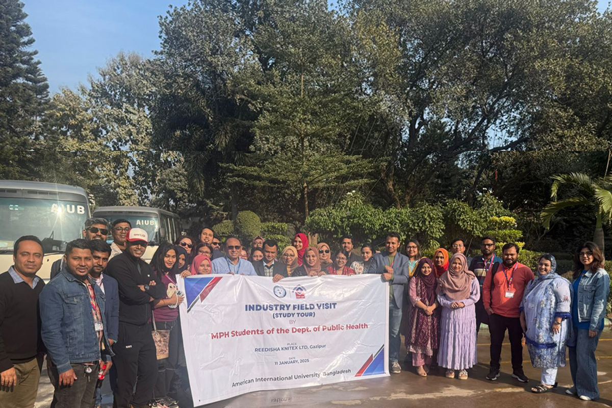 On Saturday, January 11, 2025, the American International University-Bangladesh (AIUB) organized an interactive educational field visit for its Masters of Public Health (MPH) students to enhance their practical understanding of occupational health practices. Forty-five students visited three factories under Reedisha Industries Limited located in Gazipur — Reedisha Knitex, Reedisha Food & beverage, and Formula One Spinning — where students engaged with industry experts, explored workplace health and safety challenges, and asked about occupational hazards and its prevention. The visit provided invaluable hands-on experience, culminating in preparing hazard analysis reports, and showcasing AIUB’s dedication to preparing skilled public health professionals to address real-world public health practice which goes with AIUB’s outcome-based curriculum.