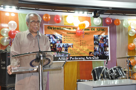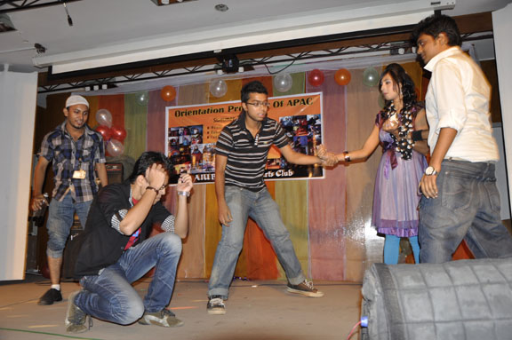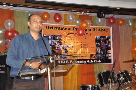 With the continuation to the long tradition, AIUB Performing Arts Club (APAC) has organized the orientation program for the new recruits for “summer 2010-2011” on 15th June 2011. The evening started at 4.00 pm with the colorful performances followed by the introductory speech & Audio Video presentation. The dazzling program was designed with various cultural performances by the regular performers & fresh recruits. There was also one segment from the new student’s feelings sharing after joining the club. There were, chorus song, duet & solo performance, dance, magic, stage play, fashion show, advertisement & Audience Game. The club mourned the tragic death of Azam Khan the legend & POP Guru of Bangladesh and kept one minute silence in his memory. They also showed tribute to him & his creation by performing one of his legendary songs “Bangladesh”.