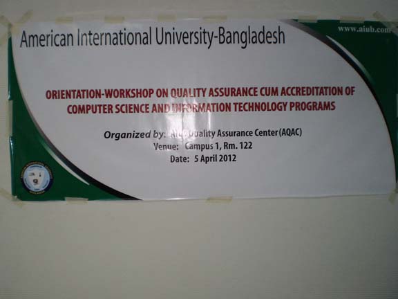 The AIUB Quality Assurance Center (AQAC) Team composed of Prof. Dr. Charles C. Villanueva, Prof. Maksudur Rahman, Dr. ABM Rahmatullah, Mr. Bikash Barua and Mr. MD. Imran facilitated the orientation and at the same time served as discussants. The topics discussed were as follows: Overview of Quality Assurance and Accreditation ; Assessment of Faculty; Curriculum and Instruction; and Laboratory. The schedule of activities was also presented and explained to guide the subcommittee members in their work. The Vice President Academics and Dean In-Charge of FSIT welcomed all the participants and underscored the importance of accreditation and the relevant activities it has to undertake. Before Mr. Mashiour Rahman, the Department of CS delivered the Vote of Thanks, some clarificatory questions were raised by the participants and these were responded properly by the Team. Mr. Mashiour posed a challenge to the participants to ensure the success of the accreditation of the FSIT programs. |