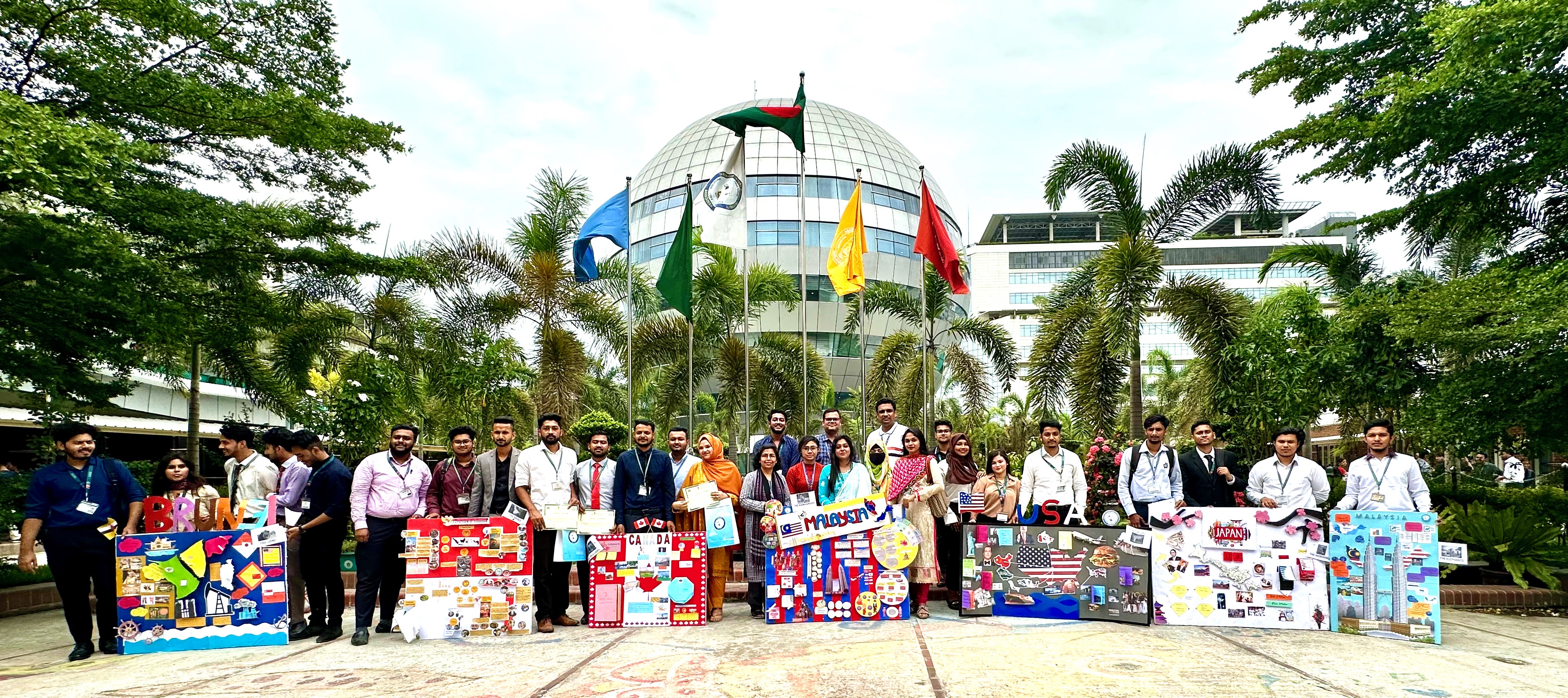 The Department of Marketing, Faculty of Business Administration (FBA), AIUB organized a student-based competitive event entitled ‘Poster Competition on International Business – Spring 2022-2023’ for the students of ‘Global Trade’ and ‘International Business’ courses of the BBA Program on Sunday, May 14, 2023. More than 65 teams from 9 sections of the mentioned courses submitted their prepared posters for Round 1, and 27 teams qualified for the Final Round. The teams prepared their respective posters from a country’s perspective, highlighting the major international trade (export and import items), national competitive advantage, culture, tourist destinations, culinary and entertainment, and highlighted the major investment opportunities.