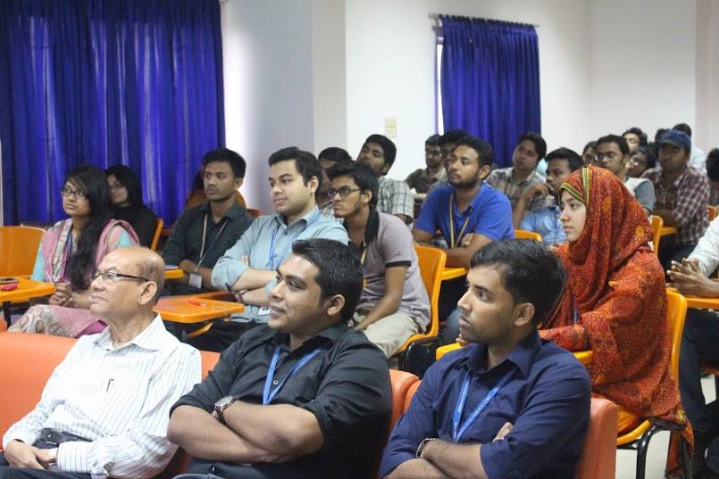 Prof. Dr. A.B.M. Siddique Hossain (Dean, Faculty of Engineering, AIUB) gave the opening speech where he suggested the students, to be well informed about all the information related to project & thesis and choose the area of research according to their interest. The first speaker, Mr. Safayet Ahmed, commenced his presentation by greeting everyone and displaying an inspirational quotation. His slides consisted of factual and instructive materials which would assist the participants to select the topic of project & thesis. It included the arguments of choosing the particular topic, the problems he faced while doing the project and how he sorted it out. His speech contained directions specifying the topic and initial preparations required before starting the project or thesis. He mentioned the recognitions and awards he received for his excellent project. Then, the next speaker, Mr. Md. Abdur Rahman Nayem, at the very beginning, asked the students those who are interested in doing thesis, to make a habit of reading. “Read, Read and Read”, this was the tag line statement for emphasizing on the importance of reading habit. He suggested to distribute the work of the thesis amongst the group members properly so that the pressure of the work would be eased and the respective works of the fellow members would be more accurate and specific. He also stated how he had chosen his thesis topic. He also discussed how he solved the problems that he had confronted while doing his thesis.