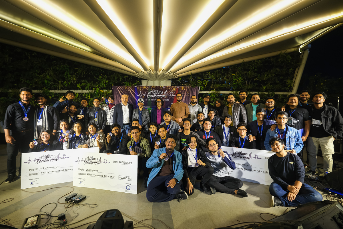 On the 26th of December 2022, each band took the stage at the AIUB Amphitheatre, where they put up incredible performances that echoed with beautiful melodies, resounding energy, and the drive to prove themselves as the music maestros of the future! Every band received praise and applause from the judges and the crowd alike. The live session was judged by Sheikh Ishtiaque and Ibrahim Ahmed Kamal, along with Bappa Mazumder (Singer, Lyricist, Composer, & Founding Member, Dalchhut) as the Special Guest Panelist. Together they not only provided valuable guidance and insight to the participating bands, but also took the stage themselves with an impromptu jamming followed by a series of brilliant performances covering some of their legendary songs that had the crowd cheering for encores. Finally, they announced the winners, presenting them with the crest, medals, and prize money. ‘Rockfish’ from Notre Dame College and Rajuk Uttara Model College became the 2nd Runners-Up, while ‘Moonshine’ from Dhaka Imperial College became the 1st Runners-Up, and ‘Auvro’ from SOS Hermann Gmeiner College took the title as the Champions. ‘Bishorgo’ from Dhaka Residential Model College and ‘Protocol’ from Dhaka City College were presented with medals as the Finalists in the competition. All participating bands, along with the finalists and winners were provided with certificates as well.