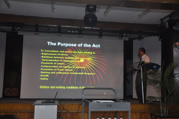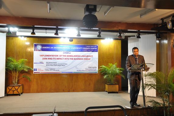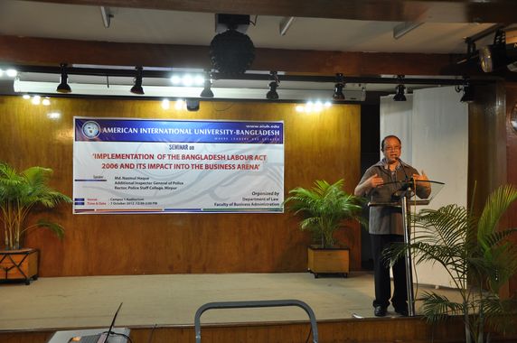 On 7th October 2012 at 12.30 p.m, Under the Department of Law of the Faculty of Business Administration, AIUB, Barrister Shahariar Rakib Hasan Khan organized a seminar on ‘Implementation of The Bangladesh Labour Act 2006 and its impact into the Business Arena’. The stated seminar held in the Auditorium of Campus 1, AIUB, where the valuable speech was given by Prof. Dr. Charles C. Villanueva, Dean, Faculty of Business Administration along with the Guest speaker, MD. Nazmul Haque, Additional Inspector General of Police, Rector, Police Staff College, Bangladesh. Mr. Haque discussed the highlights of the law and the impact on promoting business in the country. His discussion has stimulated lively interactions with the students and faculty. As a gesture of thanks and appreciation, Dr. Charles, on behalf of the university, presented a Certificate of Appreciation and souvenir items to the guest speaker Mr. Haque.