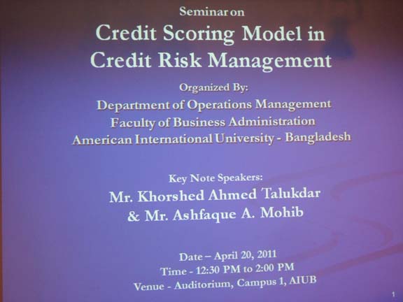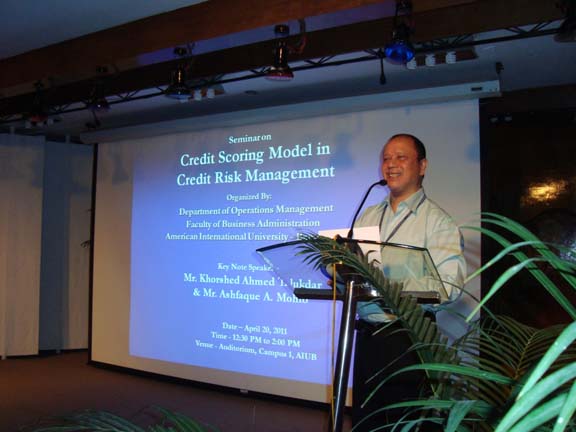 A seminar entitled "Credit Scoring Model in Credit Risk Management" was held on April 20th, 2011 at 12:30 to 2:00 pm in the AIUB Auditorium, organized by the Department of Operations Management. Prof. Dr. Charles C. Villanueva was the chief guest at the seminar. He delivered the welcome speech with his inspiring and motivational words. Mr. Khorshed Ahmed Talukdar and Mr. Ashfaque A. Mohib, faculty of Business Administration were the resource speakers of this seminar. Prof. Dr. Matiur Rahman, Associate Dean, faculty of Business Administration, Mr. Zobair Shibli, Head, Department of Operations Management, Mr. Zakaria Masud, Head, Department of Accounting, Dr. Dulal Miah, Head, Department of Finance and many other honorable faculty members also attended the seminar.