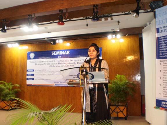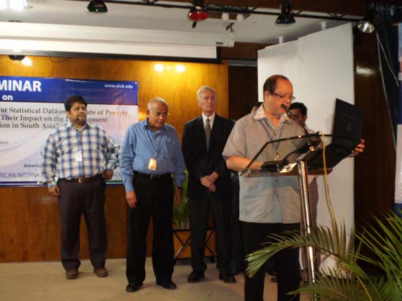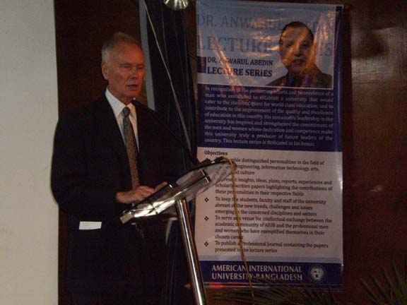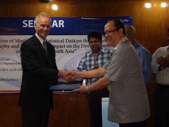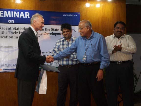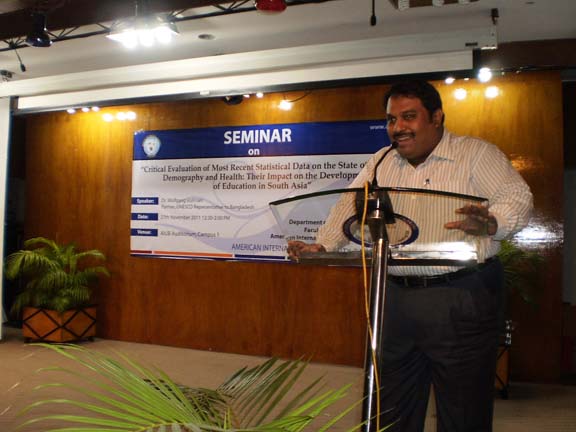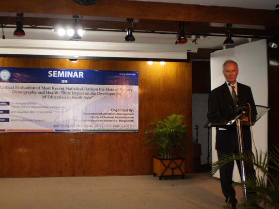 For the third time, Dr. Wolfgang Vollman, the former UNESCO Representative to Bangladesh was again featured in the aforesaid seminar. After coming from Nepal, Dr. Vollman came to Bangladesh to fulfill our invitation to deliver a lecture. He has selected this topic in view of the recent statistical data which he compiled and analyzed particularly in the South Asian Region. It was interesting to note of the comparison of the various indicators especially with reference to Bangladesh performance on poverty alleviation, population or demography and health condition of the people. Both the faculty and students raised some questions which are relevant to the topic and resulted to better understanding of the situation obtaining in South Asian region. Mr. Vollman is a familiar figure in the university but the usual courtesy and appreciation for his expertise was properly accorded to him by Prof. Dr. Charles C. Villanueva, Dean Faculty of Business Administration and who at the same time a UNESCO Consultant on education. Prof. Dr. Tazul Islam, Dean Faculty of Arts and Social Sciences, Dr. Ehsanul Huda, Director of the BBA Program, Dr. ABM Ramatullah, Head Department of Economics and Deputy Director of AQAC, and the faculty of FASS and FBA were present during the seminar. His presentation can be uploaded on the web so that the faculty and students can utiize it in their related classroom discussions.