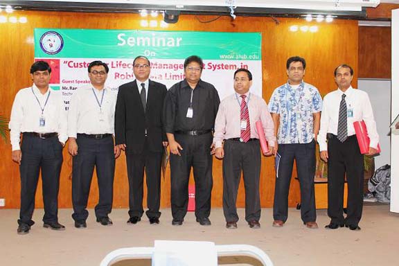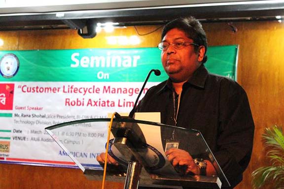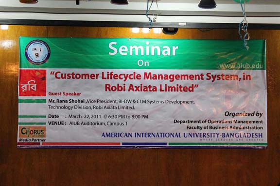 The Department of Operations Management, Faculty of Business Administration, American International University-Bangladesh organized a seminar entitled “Customer Lifecycle Management Systems in Robi Axiata Limited” on 22nd March 2011. The target audience was the MBA students of the courses of operations managements, business statistics & decision model, brand & product management, and research methodology. The main purpose of the seminar was to discuss customer life cycle management from a practical point of view, in a multinational telecommunication industry. The seminar took place in the AIUB Auditorium from 6:30 p.m. to 8:00 pm.