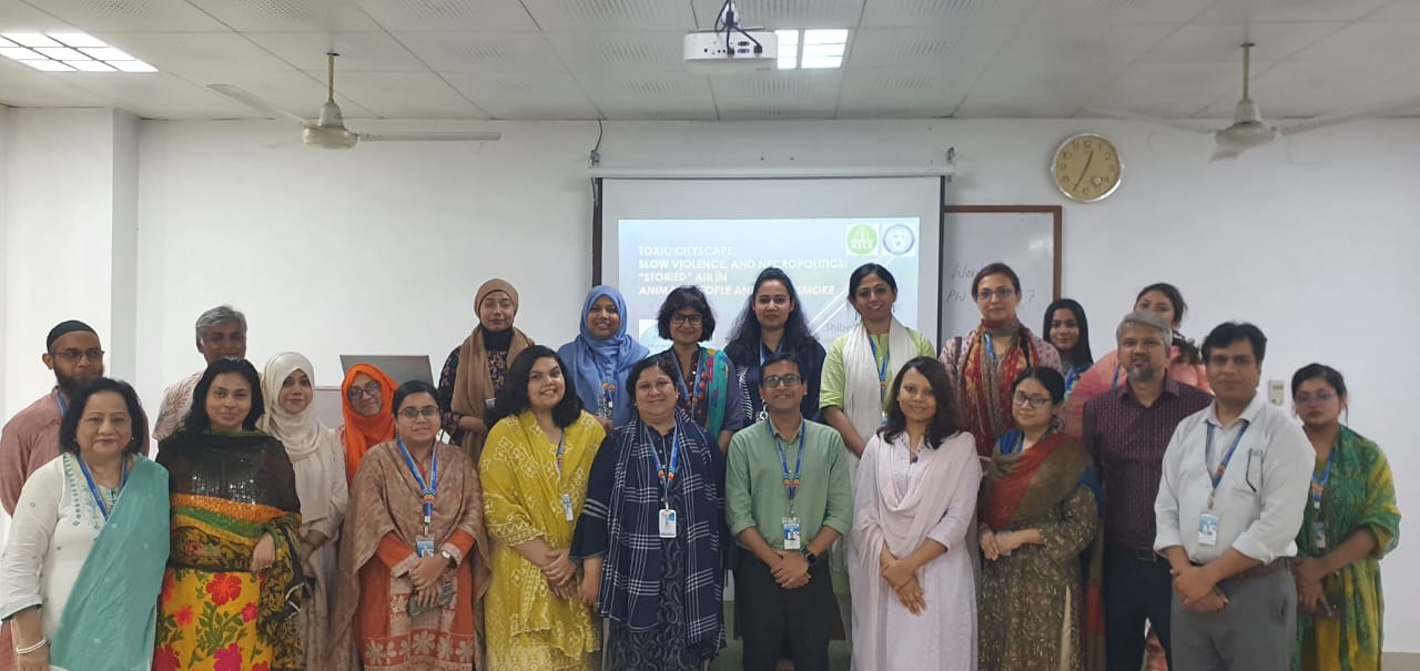 On Thursday, July 24, 2025, a seminar was held at the Faculty of Arts and Social Sciences (FASS), featuring a presentation by Shibaji Mridha titled "Toxic Cityscape, Slow Violence, and Necropolitics: 'Storied' Air in Animal’s People and Moth Smoke." Moderated by Professor Dr. Md. Asif Kamal, the session explored the ways in which literature reflects themes of environmental degradation, systemic violence, and necropolitical control in urban contexts. The research paper was originally presented at the ASLE 2025 Biennial Conference, Collective Atmospheres: Air, Intimacy, and Inequality, with the support of a travel grant provided by AIUB to encourage faculty research activities. The seminar provided a valuable platform for interdisciplinary dialogue and critical engagement. It was organized by the FASS Faculty Research Committee (FRC) in collaboration with the Office of Research.
