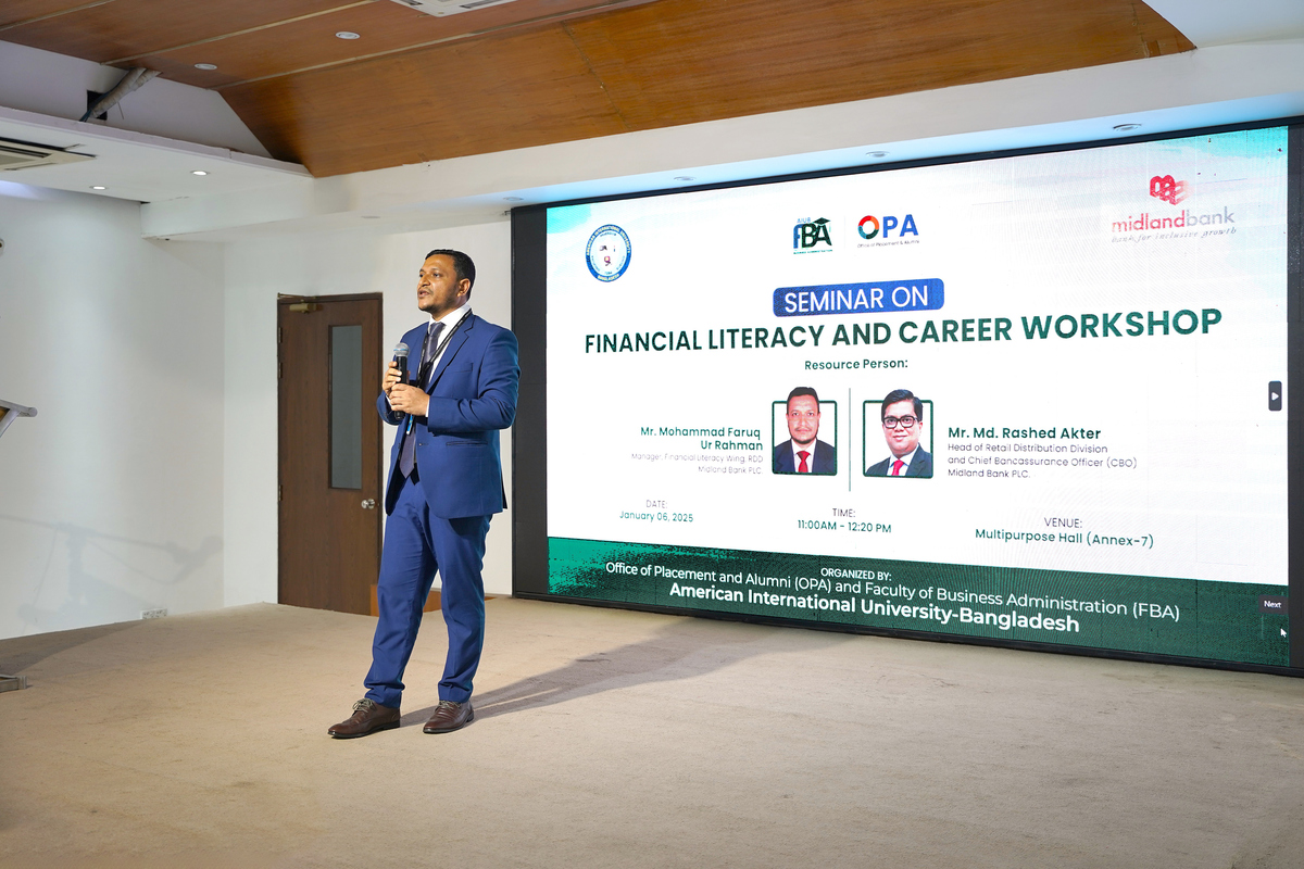 On Monday, January 6, 2025, the Office of Placement & Alumni (OPA) and the Faculty of Business Administration (FBA) of the American International University-Bangladesh (AIUB) jointly organized a seminar captioned “Financial Literacy and Career Workshop”, in collaboration with Midland Bank PLC. at the Multipurpose Hall Annex 7.