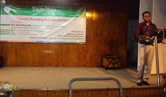 The Department of Finance at American International University-Bangladesh organized a seminar entitled “Islamic Banking in a new horizon” on 28th September 2011. The target audience was the students of Bank Fund Management, Working Capital Management and Introduction to business. The main purpose of the seminar was to clarify the concept of Islamic Banking and its role in the financial system. The program started with the welcome address of the honorable head of the Department of Finance, Dr. Md. Dulal Miah. The resource person of the seminar was Md. Kabir Hossain, Executive Vice President and Zonal Head (Dhaka North Zone) Islami Bank Bangladesh Limited. Honorable Dean of Faculty of Business Administration, Prof. Dr. Charles C. Villanueva, MBA program director, Dr. Nisar Ahmed and many other faculty members were also present at the seminar.