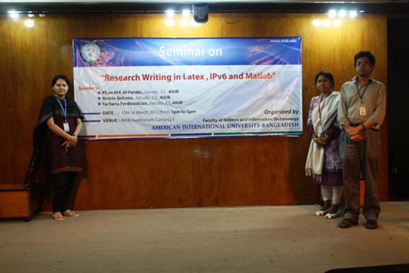 The Department of Computer Science, Faculty of Science and Information Technology, American International University-Bangladesh organized a seminar entitled “Research writing in Latex, IPv6 and Matlab” on 15nd March 2012. The target audience was undergraduate students of the courses of Computer Science, Electronics and Electrical Engineering, Business Administration, and research methodology. The main purpose of the seminar was to discuss with students about the research writing in Latex , large scale network design with IPv6 and large scale data analysis strategies in MatLab. The seminar took place in the AIUB Auditorium from 1.00 p.m. to 5:00 pm.