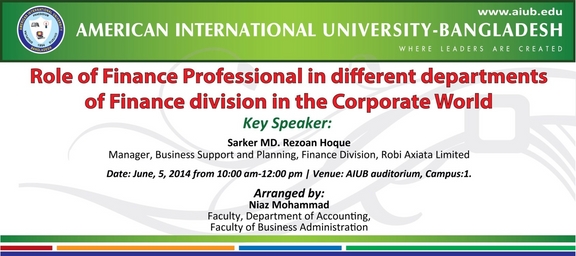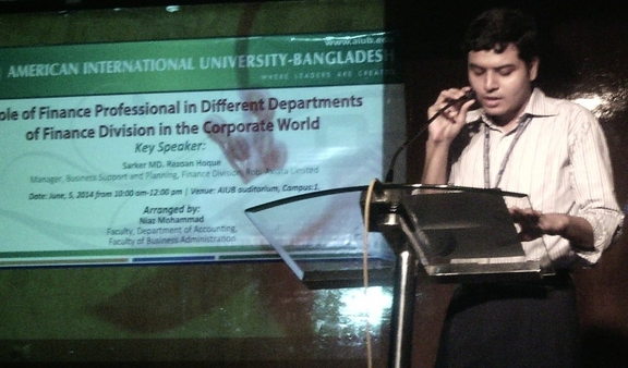 On June 5, 2014, a seminar titled ‘Role of Finance Professionals in Different Departments of Finance Division in the Corporate World’ was organized by the Department of Accounting to give students an overview of the different departments in Multinational companies. The seminar was arranged by Mr. Niaz Mohammad, Faculty, Department of Accounting, Faculty of Business Administration. The resource speaker was Sarker MD. Rezoan Hoque, Manager, Business Support and Planning, Finance Division, Robi Axiata Limited. The seminar provides the overall ideas regarding Treasury Operations, Business Control and Analysis, Budget Planning, Accounts and Reporting, Supply Chain Management and Compliance department. Mr. Sarker also shared practical experience towards students as he previously worked in IDLC Finance Limited and Standard Chartered Bank, the leading NBFI and MNC respectively, in a managerial role. Mr. Sarker’s lively and interactive presentation makes this event productive. Participation of students from different courses made the seminar more informative. The main objective of this seminar was to get familiar with the students who opt to work in multinational companies so that they can prepare themselves.At the end of the seminar, Mr. Zakaria Masud, Head, Department of Accounting, expressed his Vote of thanks to the Guest Speaker and presented him with a Certificate of Appreciation along with a gift pack as a Token of Gratitude with the presence of other faculty members.