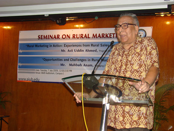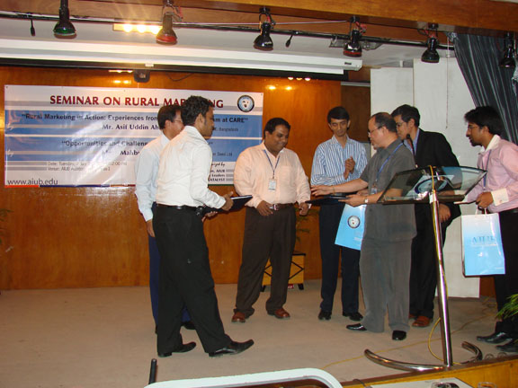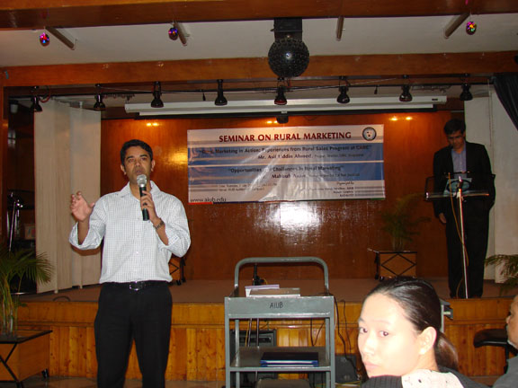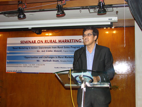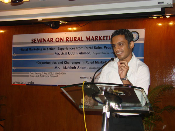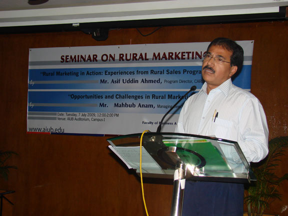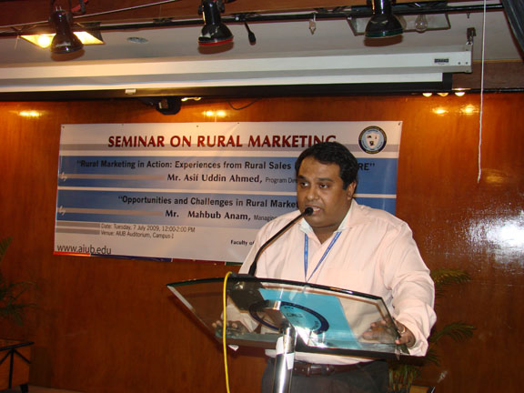 A Tripartite sponsored project on Introducing Rural Marketing as a course had a Seminar on Rural Marketing specifically on the following topics/themes: “Rural Marketing in Action: Experiences from Rural Sales Program” with Mr. Asif Uddin Ahmed of Care as discussant and “Opportunities and Challenges in Rural Marketing” with Mahbub Anam of Lal Teer Seed Ltd. The seminar as an opening salvo to entice students to take up Rural Marketing as one of the major courses in BBA/MBA major in Marketing was held in the Auditorium of the American International University-Bangladesh (AIUB) on 7 July 2009 being one of the sponsors together with KATALYST and Future Leaders. The resource speakers discussed about the definition of Rural Marketing with CARE-Bangladesh experience as a model. The other presentation delved on the cultural orientation and practices of the rural folks as an important factor in rural marketing as a business strategy. The discussions were so interesting that we expect the marketing students to take up Rural Marketing as a course considering the prospects and demand of BBA/MBA graduates with adequate background on rural marketing.