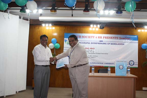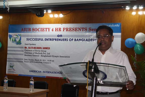 The Management Department of American International University-Bangladesh and AIUB Society 4 HR organized a seminar on “Successful Entrepreneurs of Bangladesh” on 20th March 2011. The target audience was the students of the course in entrepreneurship development. The main purpose of the seminar was to promote entrepreneurship in Bangladesh. The seminar took place in the Auditorium from 11:00 a.m. for one hour. The program started with the welcome address of the honorable Associate Dean, Dr. Matiur Rahman. The resource person of the seminar was Mr. Kutubuddin Ahmed, Chairman of Envoy Group, Chairman of Sheltech Pvt. Ltd, and Secretary General of Bangladesh Olympic Association. Dr. Ehsanul Huda Chowdhury, Director, BBA Program; Mrs. Farheen Hassan, Head, Department of Management and many other faculty members were also present at the seminar.