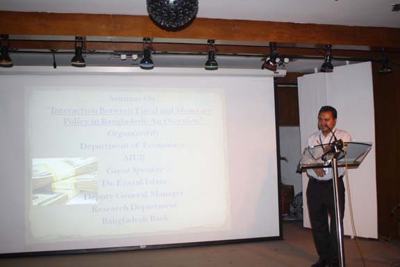 The Department of Economics of American International University-Bangladesh organized a seminar on “Interaction between Fiscal and Monetary policy in Bangladesh” on 29th March, 2011. The target audience was the students of the BSS Economics and the students Majoring in Economics. The main purpose of the seminar was to introduce the students with the practical knowledge and practice of monetary and fiscal policies in Bangladesh. The seminar took place in the Auditorium from 12:30 p.m. the duration of which was two hours. The program started with the welcome address of the honorable Dean of FASS, Dr. Tajul Islam. The guest speaker of the seminar was Dr. Ezazul Islam, DGM, Research Department, Bangladesh Bank. Dr. Matiur Rahman, Associate Dean, faculty of Business Administration, and many other faculty members of the De[artment of Economics were also present at the seminar.