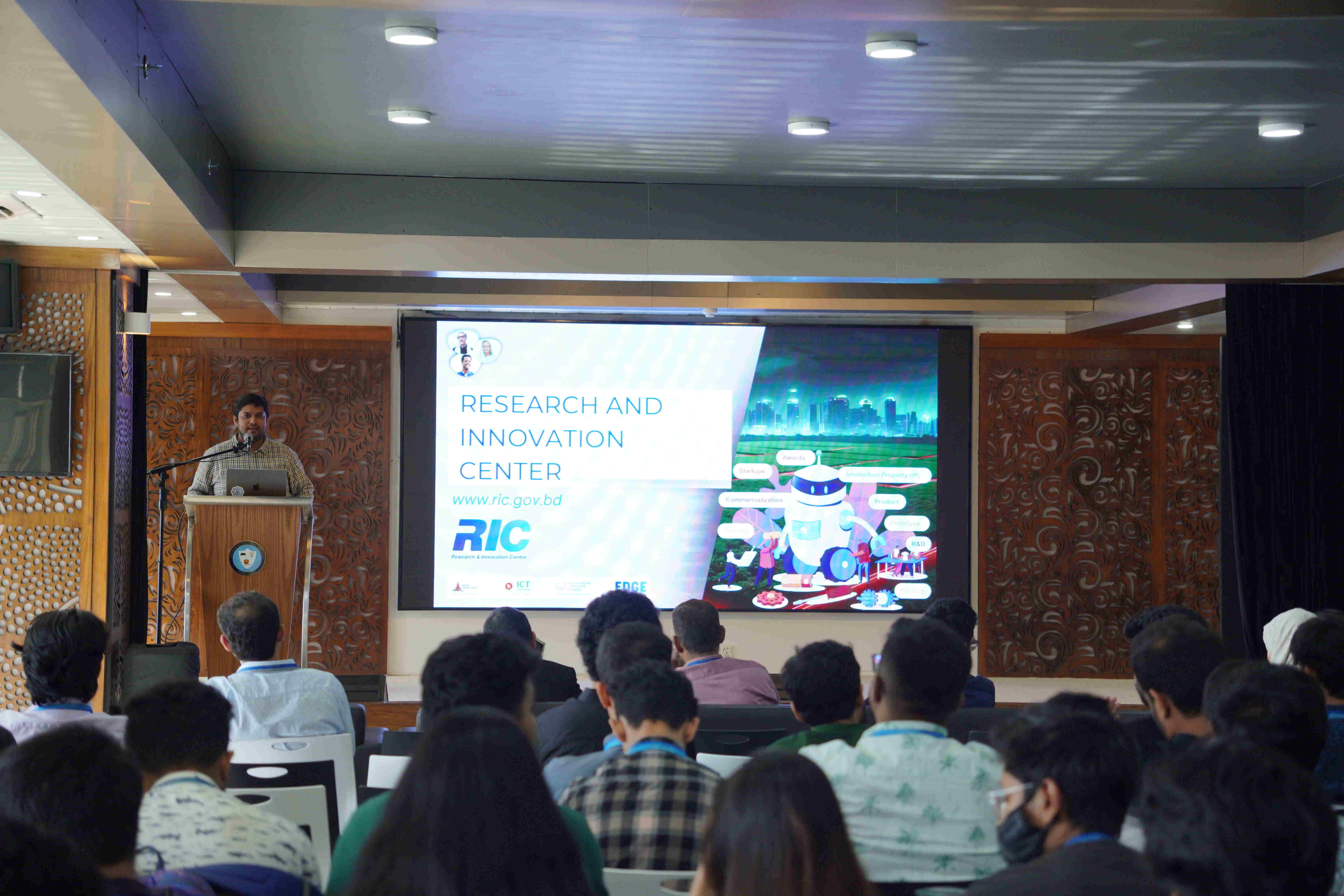 The next topic of discussion was the three primary RIC components. With the goal of conducting research and innovation projects, these RICs hope to promote cooperation between government, academia, and industry stakeholders. The missions of RIC—problem solving, economic value creation, IP generation, commercialization, new innovative startup, spinoff company, and support for the national goals of Smart Bangladesh—were also mentioned by Mr. Rusafi. Then he demonstrated the first round of the project's process, which includes the announcement of the call for papers in February 2024, the evolution process in March 2024, research, innovation, mentoring, and monitoring, as well as the award ceremony and fund release. The speaker went on to discuss how RIC, with its key components of Knowledge Creation, Frontier Technologies, $12,500 per capita Income, Developed Country by 2041, and Innovation Economy, is ideally positioned to support smart Bangladesh. Furthermore, he demonstrated the project's focus areas for problem solving, which include water, the environment, cyber-security, culture, food, health etc. At the end of the presentation Mr. Rusafi encouraged every attendee to be innovative and smart with Smart Bangladesh. Next, Mr. Syed Nazmul Karim (Project Manager, Digital Economy Business Development, EDGE Project) took the stage to discuss putting in proposals for research and developing prototypes. Throughout the Q&A session, numerous inquiries from the audience surfaced, including how many research proposals can be applied for and the procedure for submitting proposals, among other things. The presenters outlined the submission procedure, which entails submitting a PowerPoint online, presenting the research proposal in front of the jury, and having the jury select the best proposal. They added that working with a commercial company is possible if the budget is large.