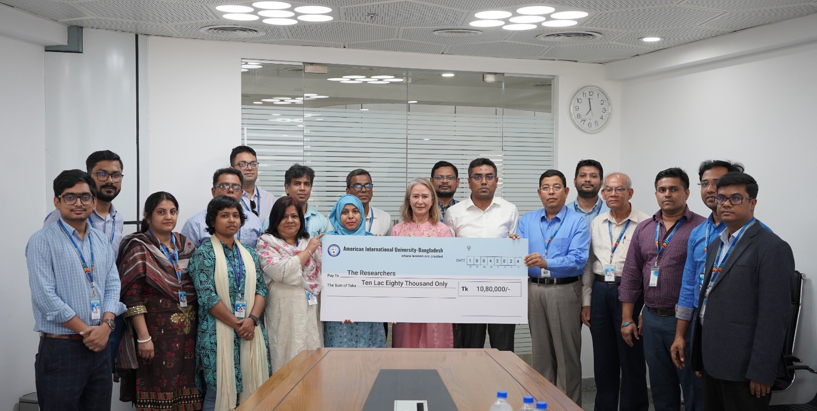 On 18th April 2024, the Office of Research of the American International University-Bangladesh (AIUB) arranged a deed signing ceremony with the researchers whose project proposals have been approved for the research grant offered to all the four faculties namely Faculty of Arts and Social Sciences (FASS), Faculty of Business Administration (FBA), Faculty of Engineering (FE) and Faculty of Science and Technology (FST). To promote the research activities of AIUB's faculty members align with the United Nations' Sustainable Development Goals (SDGs), particularly SDG 3 (Good Health and Well-Being), SDG 4 (Quality Education), SDG 9 (Industry, Innovation, and Infrastructure), and SDG 17 (Partnership for Goals). Dr. Carmen Z. Lamagna, Member, Board of Trustees of AIUB was present during the signing ceremony and handed over the cheque to the investigators. The Pro-Vice Chancellor, Deans, Directors, In-Charge of the Office of Research, and the representatives of Faculty Research Committees (FRC) were also present during the ceremony. Dr. Lamagna inaugurated the signing of the deeds with her valuable guidelines for the researchers. The Deans of the respective faculties also shared their valuable remarks. A total of 15 Investigators and Co-Investigators for seven project proposals from all the four faculties of AIUB were awarded with the grant.