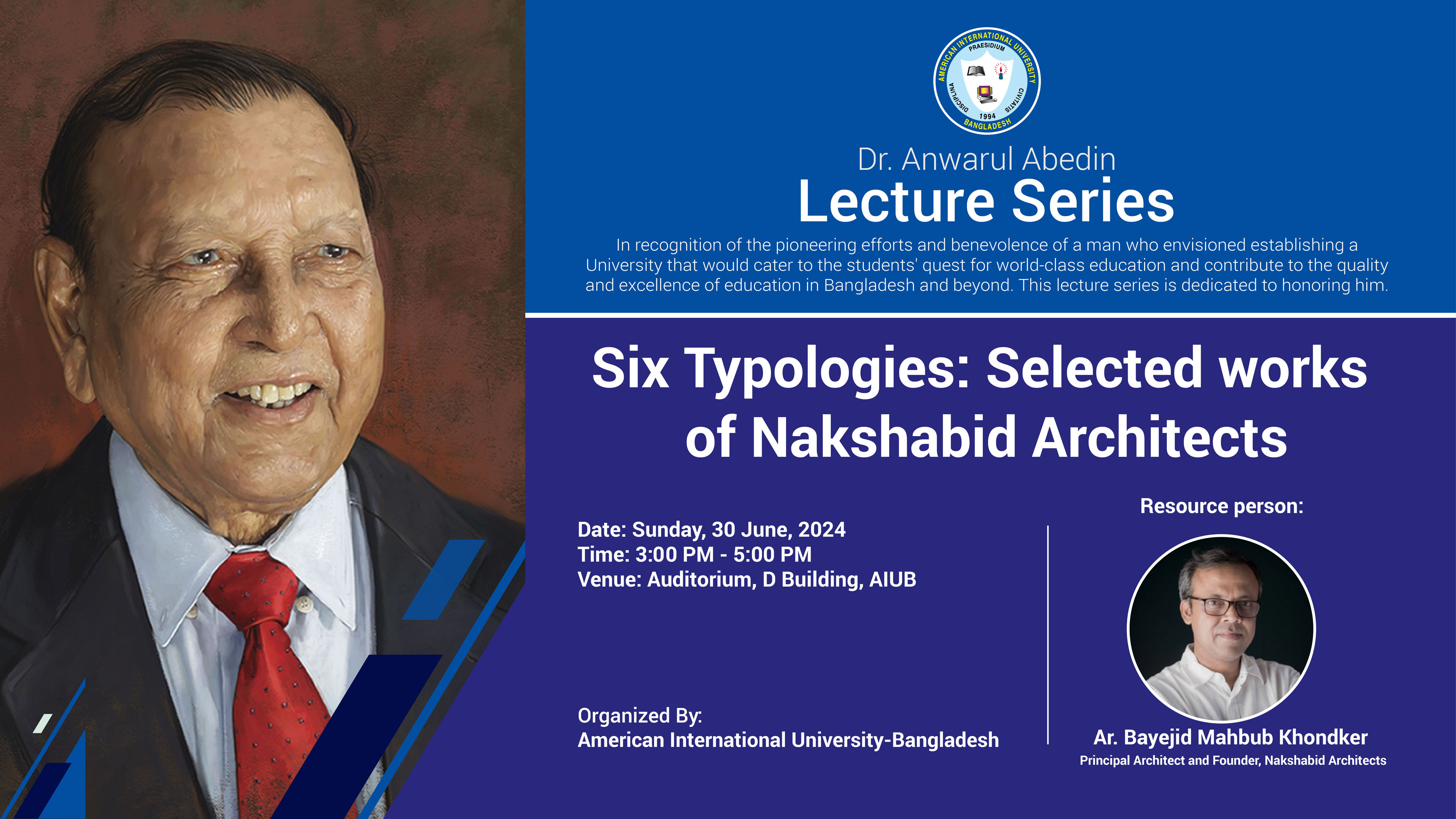 The Department of Architecture, American International University-Bangladesh (AIUB) organized a lecture event under the banner of the 'Dr Anwarul Abedin Lecture Series' where prominent architect Bayejid Mahbub Khondker delivered a lecture on “Six Typologies: selected works of Nakshabid Architects” on Sunday, June 30, 2024, at AIUB auditorium. Architect Bayejid Mahbub Khandaker recently received the prestigious Royal Institute of British Architects [RIBA] International Award for Excellence 2024. In addition to this remarkable achievement, he has previously won two gold medals at the ARCASIA Awards for Architecture 2023.