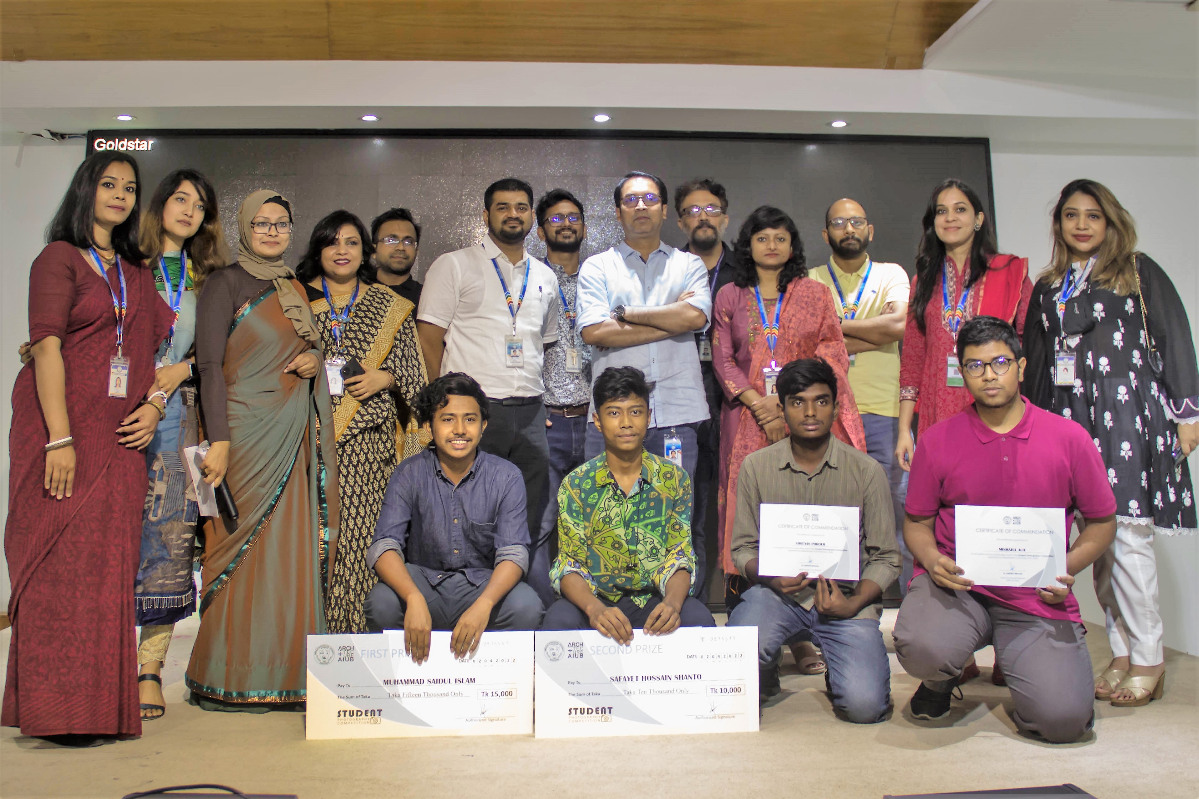 The 1st prize winner is Muhammad Saidul Islam from Kumilla (college: DKMHC ), 2nd position and 3rd position were taken by Safayet Hossain Shanto from Barisal (Barisal Collectorate School & College) and Muhammad Nazmul Hossain from Chittagong (College: Cambrian College Chittagong). There were two Commendation awards as well. The winners for the commendation awards are Shreyas Podder from BAF Shaheen College, Dhaka and Minhajul Alif from Milestone College. The winners thanked AIUB for creating this opportunity and shared their feelings which were inspiring for the audience. After announcing the winners name an encouraging speech for the students was delivered by the Ar. Ashik Ikbal. At the end , the participants were guided to the student work exhibition space and went for a tour of AIUB campus. The tour was coordinated by the faculties Ar. Nandita Barai, Ar. Chowdhury Farah Zaki, Ar. Nushrat E Huq along with enthusiased student volunteers from AIUB Architecture department.