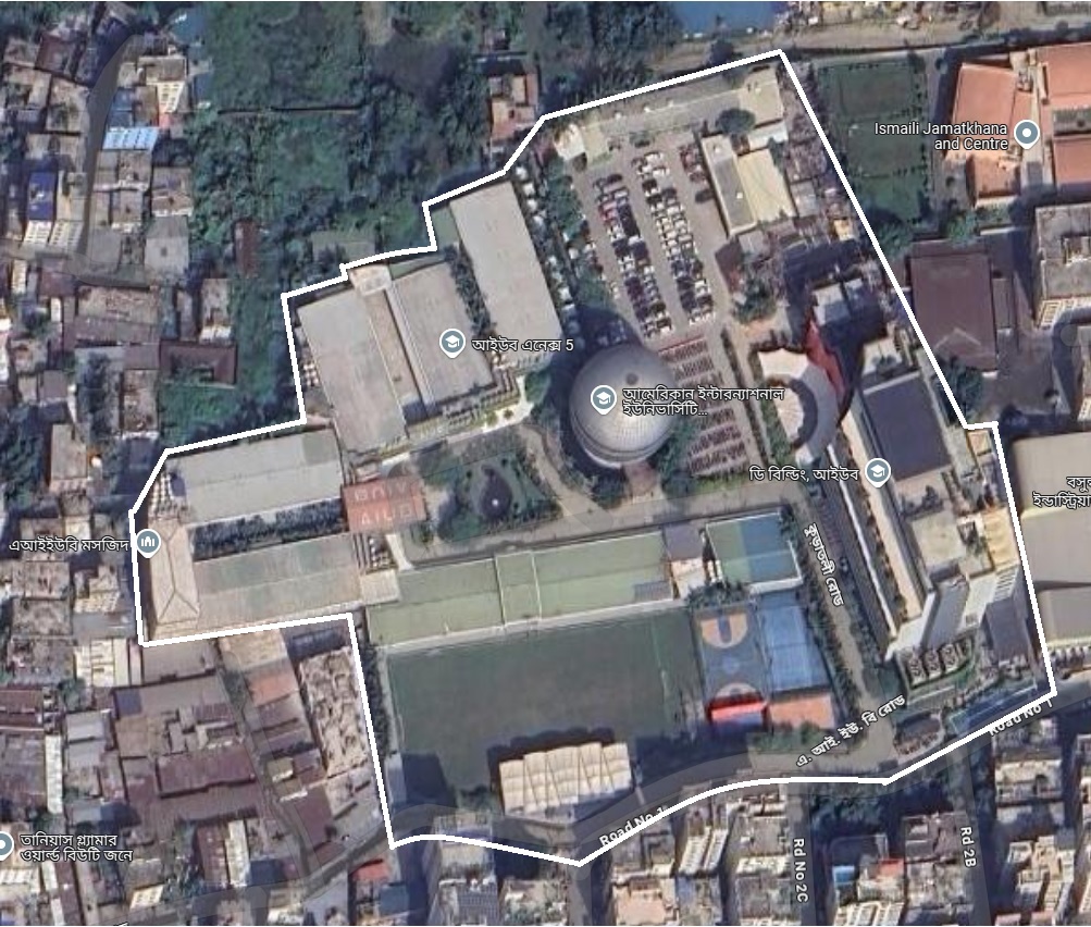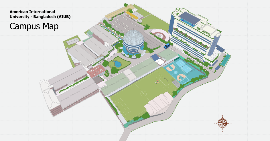 The American International University-Bangladesh (AIUB) is situated in Kuratoli, Kuril, Dhaka, within an urban setting that blends modern academic architecture with green open spaces. Its campus spans approximately 44,043.71 m² and is designed for accessibility and sustainability, offering a range of educational, administrative, recreational, and support facilities. The university's location in the bustling city of Dhaka provides strong connectivity while maintaining a peaceful and collaborative academic atmosphere.
