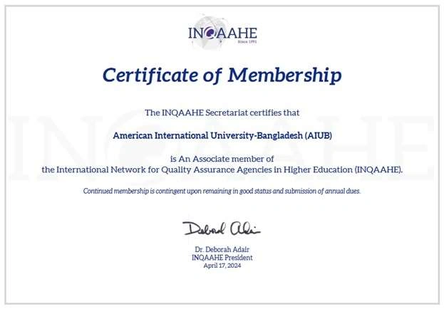 AIUB has been granted membership in the International Network for Quality Assurance Agencies in Higher Education (INQAAHE), reinforcing its dedication to international standards. This membership is a strategic international collaboration focused on SDG 4 (Quality Education) and SDG 17 (Partnerships for the Goals). INQAAHE provides a global forum for "discussion of global issues" and "share best practices," which is a method of gathering or measuring data and standards in the field of quality assurance. By joining this prestigious network, AIUB will collaborate with global professionals, adopt innovative strategies for academic excellence, and contribute to the "international dialogue on higher education quality assurance." This participation allows AIUB to benchmark its own quality assurance processes against global standards, ensuring continuous improvement and international alignment.