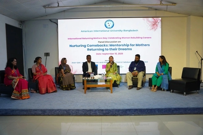 AIUB reaffirmed its commitment to gender equity and inclusiveness by celebrating the first International Returning Mothers Day, honoring women resuming careers after breaks. Organized by AIUB-IQAC, AIUB Women Forum, SHOMOY, and WePOWER, the event featured a rally, panel discussion, and presentation promoting mentorship, empowerment, and supportive policies. This initiative advanced SDGs 4 (Quality Education), 5 (Gender Equality), 8 (Decent Work & Economic Growth), 10 (Reduced Inequalities), 16 (Peace & Justice), and 17 (Partnerships for the Goals).