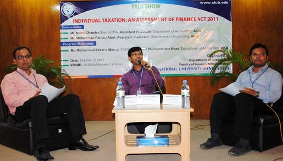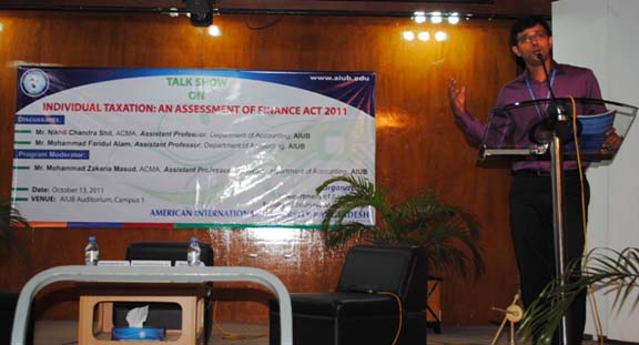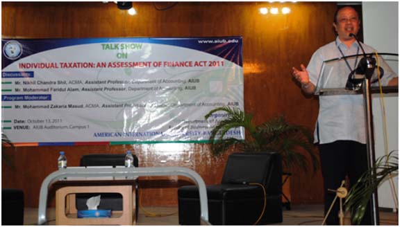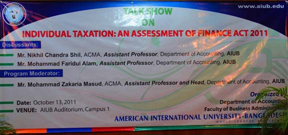 Department of Accounting, Faculty of Business Administration of American International University – Bangladesh (AIUB) has organized a Talk Show on “Individual Taxation: An Assessment of Finance Act 2011”on 13th October, 2011 in the AIUB Auditorium at 3:00 p.m. The program started with a rousing message from the Dean of Faculty of Business Administration, Dr. Charles C. Villanueva. A good number of faculty members from the Department of Accounting and Finance were also present on that occasion in the auditorium.