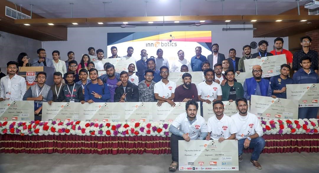 AIUB FURIOUS became the champion of the segments Shoot-Up (Drone Race) and Robo Cup (Robo-Soccer) of Innobotics 2020. The event was hosted by the UIU robotics club on 14th and 15th of February 2020. Students from various universities and colleges took part in this event to showcase their talent. The event comprised of a wide variety of activities in different segments such as: Robo Cup, War Machine, Shoot Up, Gear Up, Ant Run, Project Showcase and Poster Presentation. It is a matter of immense joy and pleasure to inform that Team AIUB FURIOUS, from AIUB became the champions of the segments Shoot Up and Robo Cup. The members of the team AIUB FURIOUS for the segment Shoot-Up (Drone Race) are; Md. Mominul Islam (Student, Dept. of EEE), Adnan Shafee (Student, Dept. of EEE), Md. Mahmudul Hasan Antor (Student, Dept. of EEE), Tofael Aziz (Student, Dept. of EEE) and Md. Meherab Hossain Pullock (Student, Dept. of EEE). And the members of team AIUB FURIOUS for the segment Robo Cup (Robo-Soccer) are; Md. Mominul Islam (Student, Dept. of EEE) and Md. Shahil Patwary (Student, Dept. of CSE). The efforts of the students were acknowledged with crests and prize money.