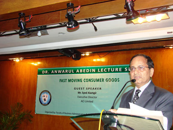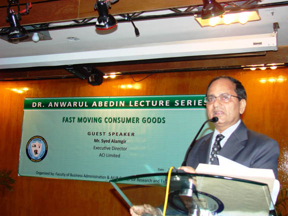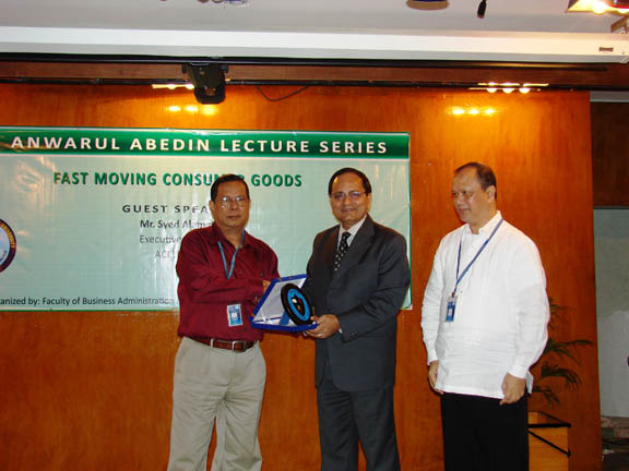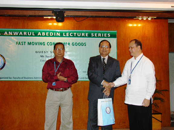 The summer edition of the Dr. Anwarul Abedin Lecture Series was held on 15 July 2008 with Mr. Syed Alamgir, Executive Director of the ACI Limited as the guest lecturer. Mr. Alamgir spoke on the topic: Fast Moving Consumer Goods which was attended by marketing students and faculty of the Faculty of Business Administration. It was a very enlightening and inspiring lecture as the speaker also challenged the students to be serious and focused on their career in addition to the interesting presentation of the ACI Ltd. company profile. The speaker expounded on the various factors that contributed to the success of ACI Ltd as a leading business company in country. His concept of HALAL soap was appreciated and accepted by the consumers which resulted to the increase in sales of the ACI Ltd. company and that of its principal affiliate international companies. After his lecture, there was an intellectual exchange with the students and faculty. Relevant and timely issues were raised by the audience. A brief video commercial presentation about the products of ACI was also featured in the program. The university through the Pro Vice Chancellor, Prof. Dr. Anwar Hossain and the Dean in Charge of the Faculty of Business Administration, Prof. Dr. Charles C. Villanueva presented the university crest and token of appreciation to the distinguished lecturer. | ||||||||||