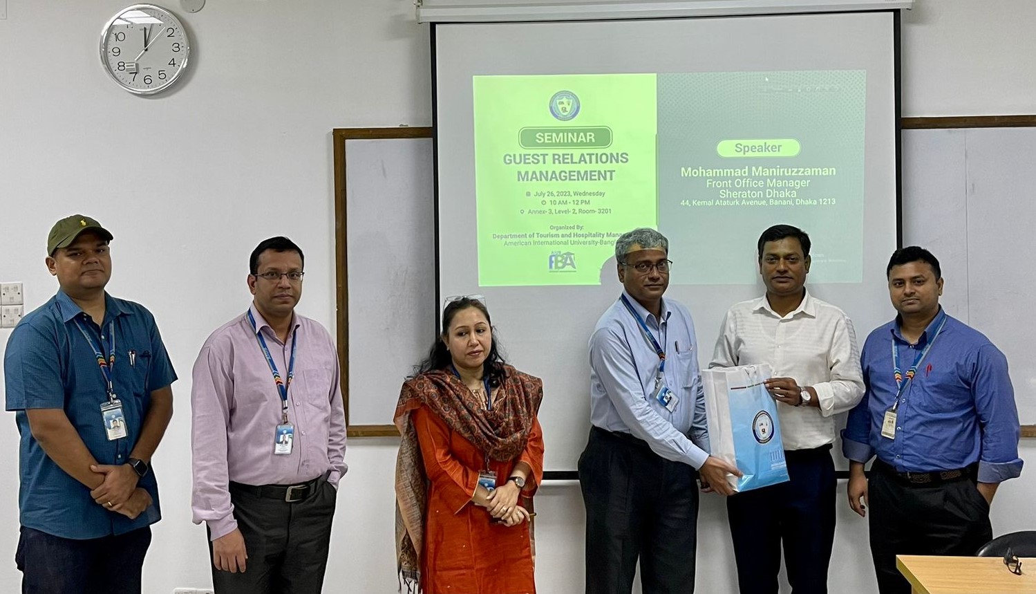 The Department of Marketing, & THM, Faculty of Business Administration (FBA) of American International University Bangladesh, organized a seminar on " Guest Relations Management" on 26th July 2023 at Room # 3203, Annex 3 for the students of Tourism and Hospitality Management. The seminar was presented by Mr. Mohammad Maniruzzaman - Front Office Manager, Sheraton, Dhaka.