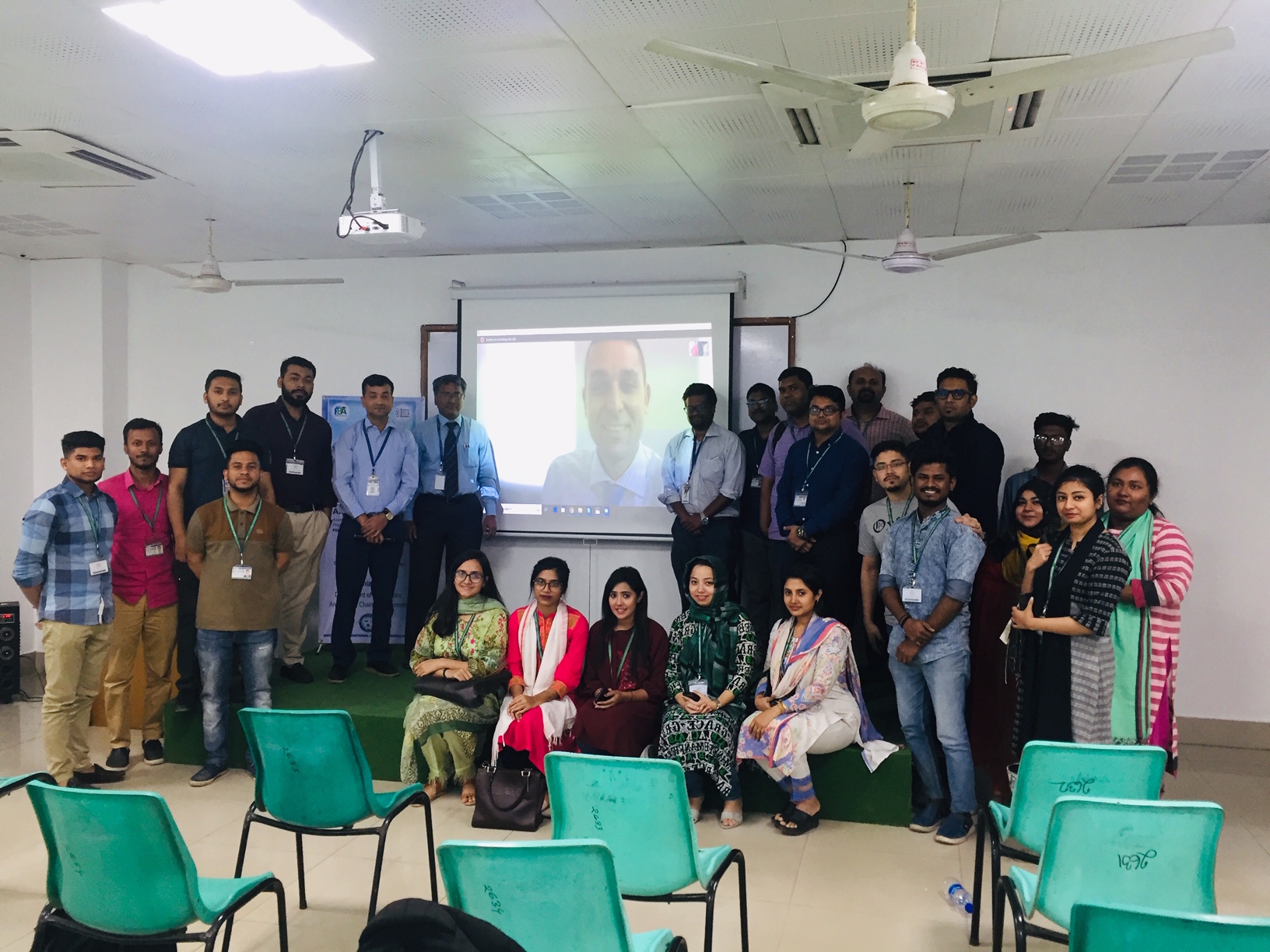 The Department of Operations and Supply Chain Management, Faculty of Business Administration organized a virtual seminar on “Global supply chain management and managing supplier involvement in NPD: how to take supplier collaboration to the next level ” on 11 March, 2020 at AIUB permanent campus, for the Executive MBA students and regular MBA students of courses Service Operations Management and Distribution Management. The resource speaker was Andrea S. Patrucco, Assistant Professor, Program coordinator, Project and Supply Chain Management, PENN STATE UNIVERSITY, PA, USA. The main objectives of this seminar were to provide our students to be virtually connected with an eminent resource speaker of a foreign country with the aid of our strong logistics support. The speaker very eloquently explained the engaging suppliers in collaborative innovation, the role of the purchasing department and management of triadic department. Prof. Andrea is very much enjoyed the question answer session where students and teachers spontaneously participated.