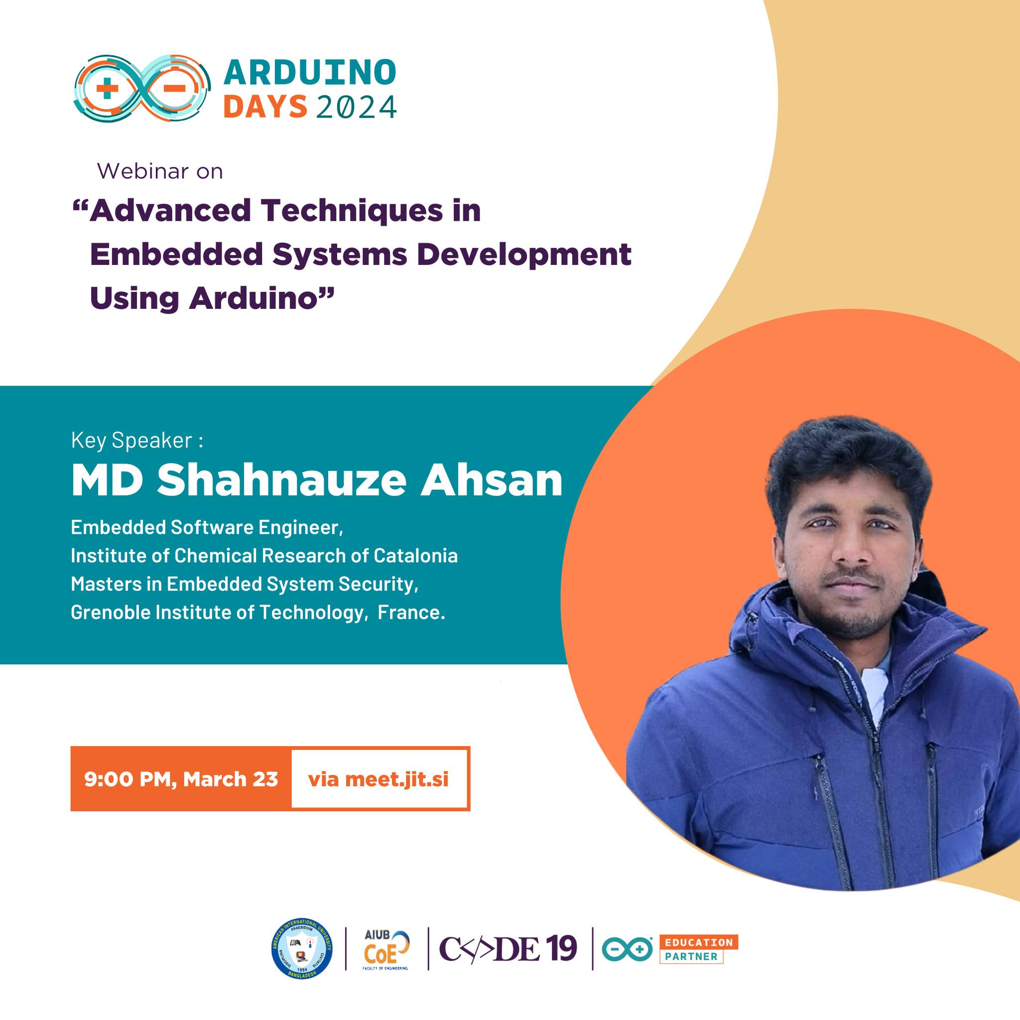 On March 23, 2024, Department of Computer Engineering (CoE), AIUB, in collaboration with the Code 19, hosted an engaging webinar titled "Advanced Techniques in Embedded Systems Development Using Arduino" to celebrate Arduino Day 2024. The webinar started at 9 p.m. with more than 40 participants. The main purpose of this webinar was to serve as a platform for enthusiasts, experts, and beginners to come together and explore the world of Arduino technology.